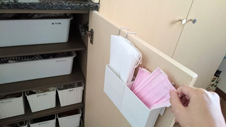 こちらも磁石が付かない場所でしたが、同じように2つのアイテムを組み合わせてマスクの空中収納をつくることができました。
