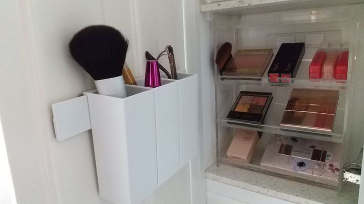 化粧ブラシ・マスカラ・メガネなど立てて入れたいものを収納し、嵩張るメイクグッズがスッキリと収まり使いやすさも格段にアップしました。