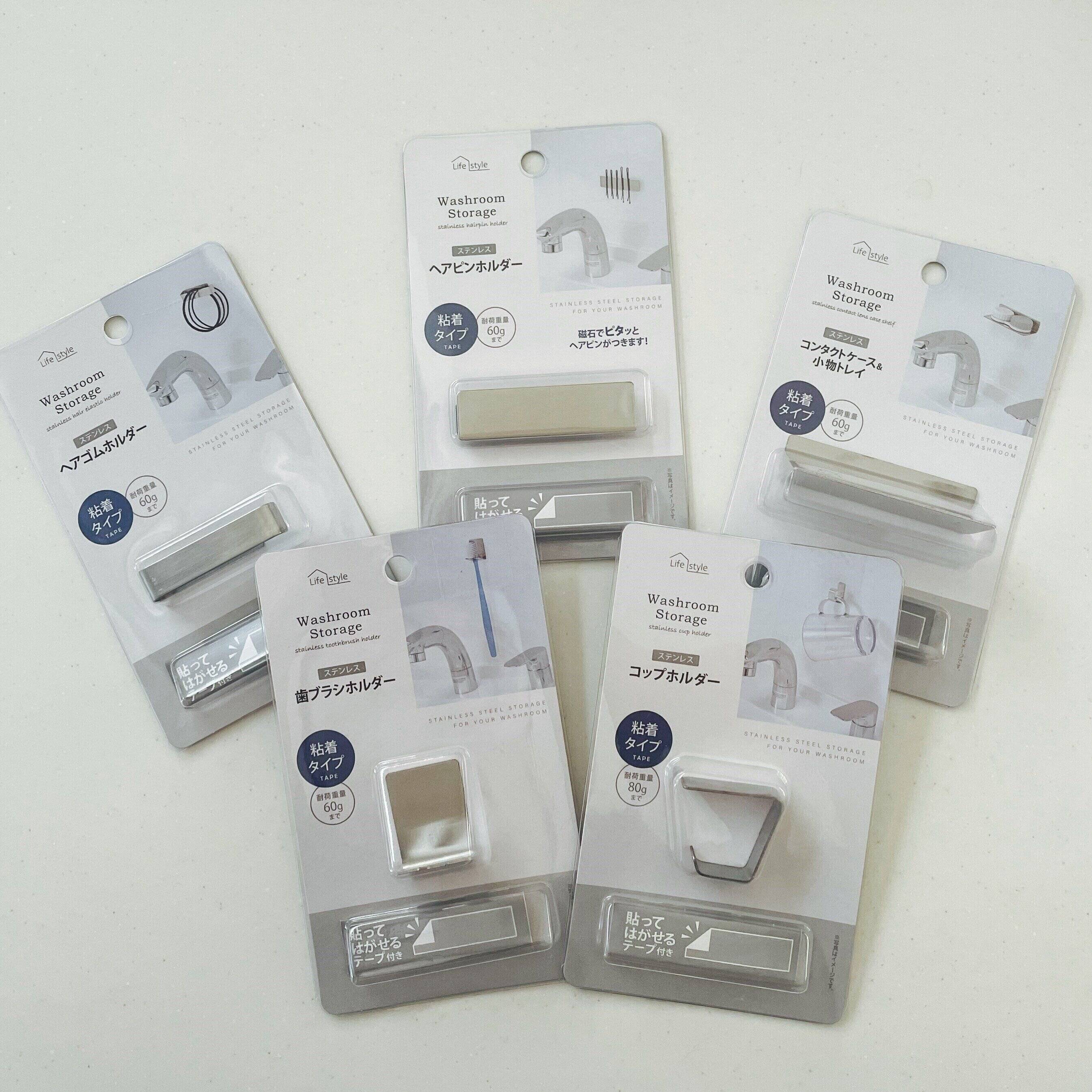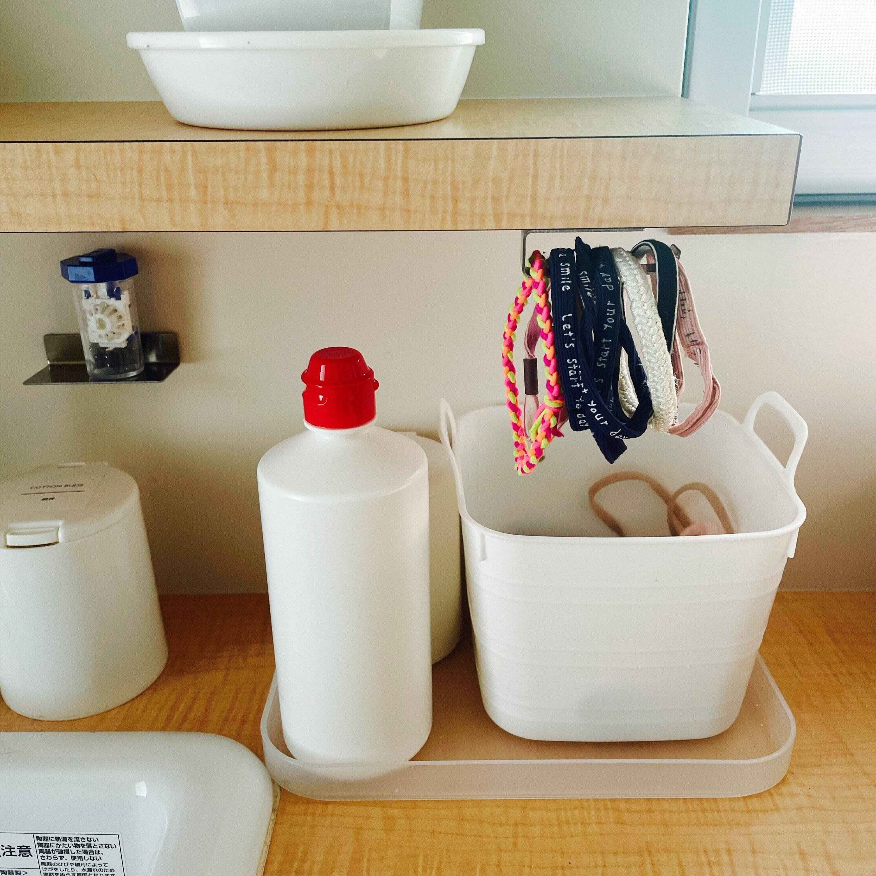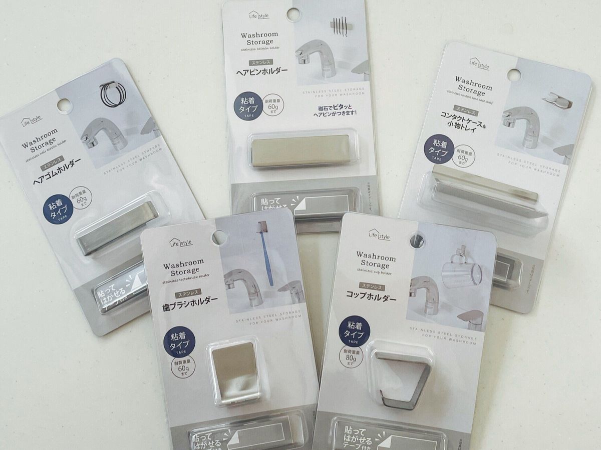 こちらのシリーズは貼るだけで簡単に吊り下げ収納ができてとっても便利になります。洗面台のこまごましたものに住所が決まるので、散らかり予防にもなっていいですよ!