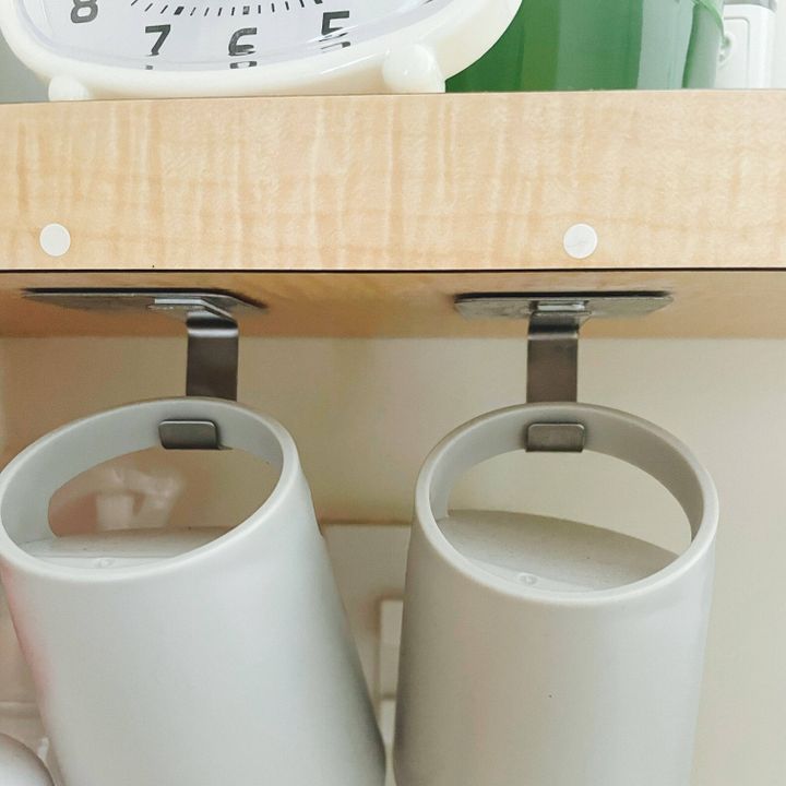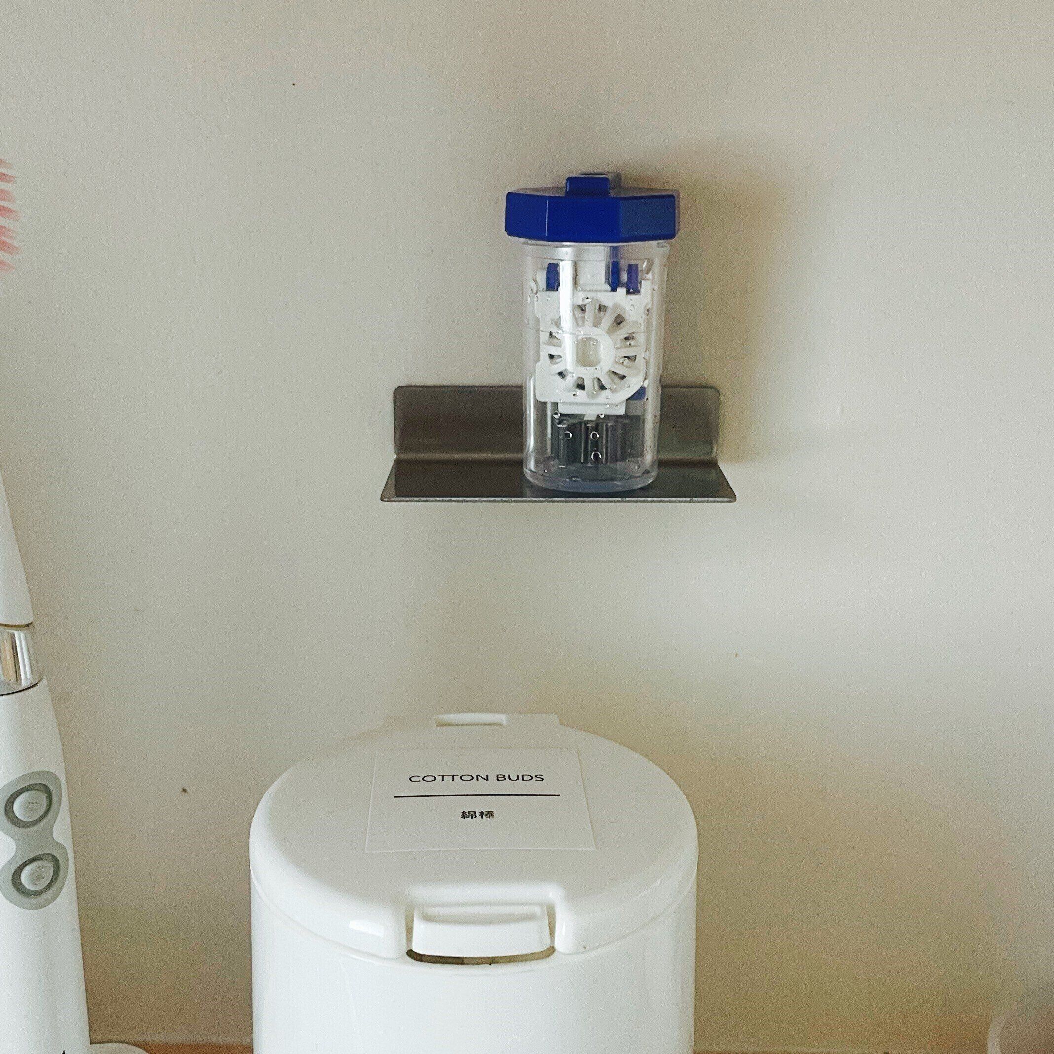 カップホルダーもパッケージに表記された貼り方ではなく、洗面台の棚裏に貼りつけています。もちろんこちらも自己責任。子どもたちが歯磨きをする際に使っているコップなのですが、吊り下げると水キレもできて便利です。