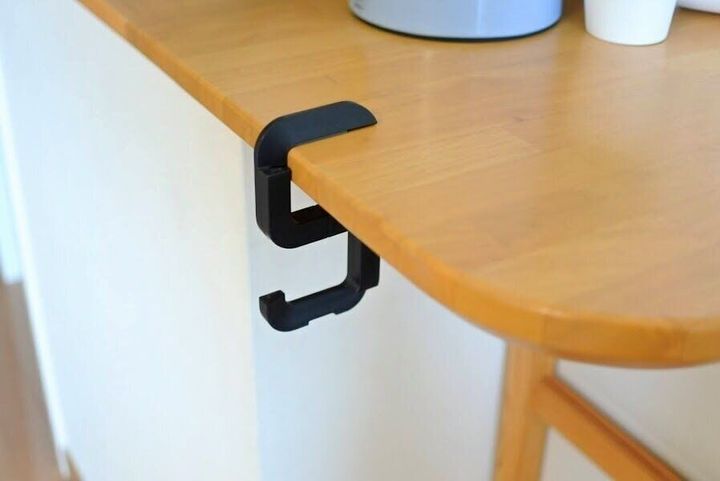 テーブルの端に引っ掛けて、こんなふうにして使います。テーブルの厚みによって、かけられないこともありますが、バッグに忍ばせておくとすごく助かります!