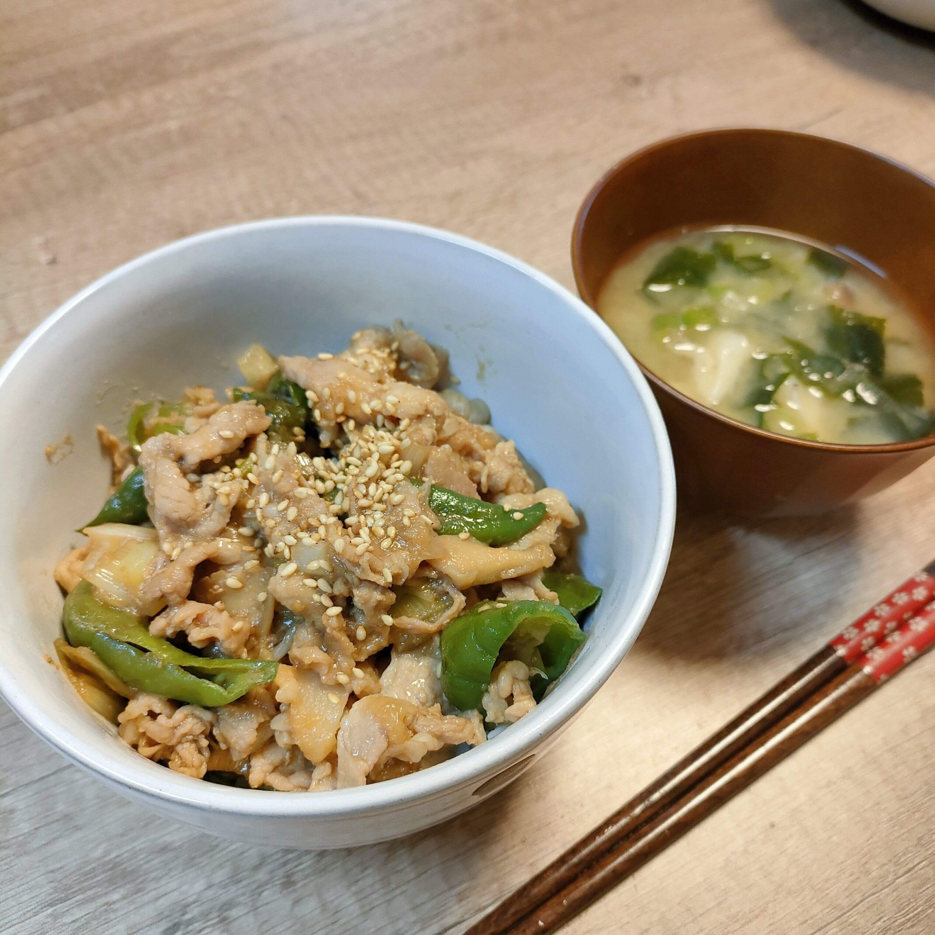緑の野菜で彩りも追加。卵があったら、卵黄をのせてもおいしいと思います。豚こま切れ肉にうまく絡んでくれて、野菜の甘さもしっかりと丼の旨味をひきだしています。