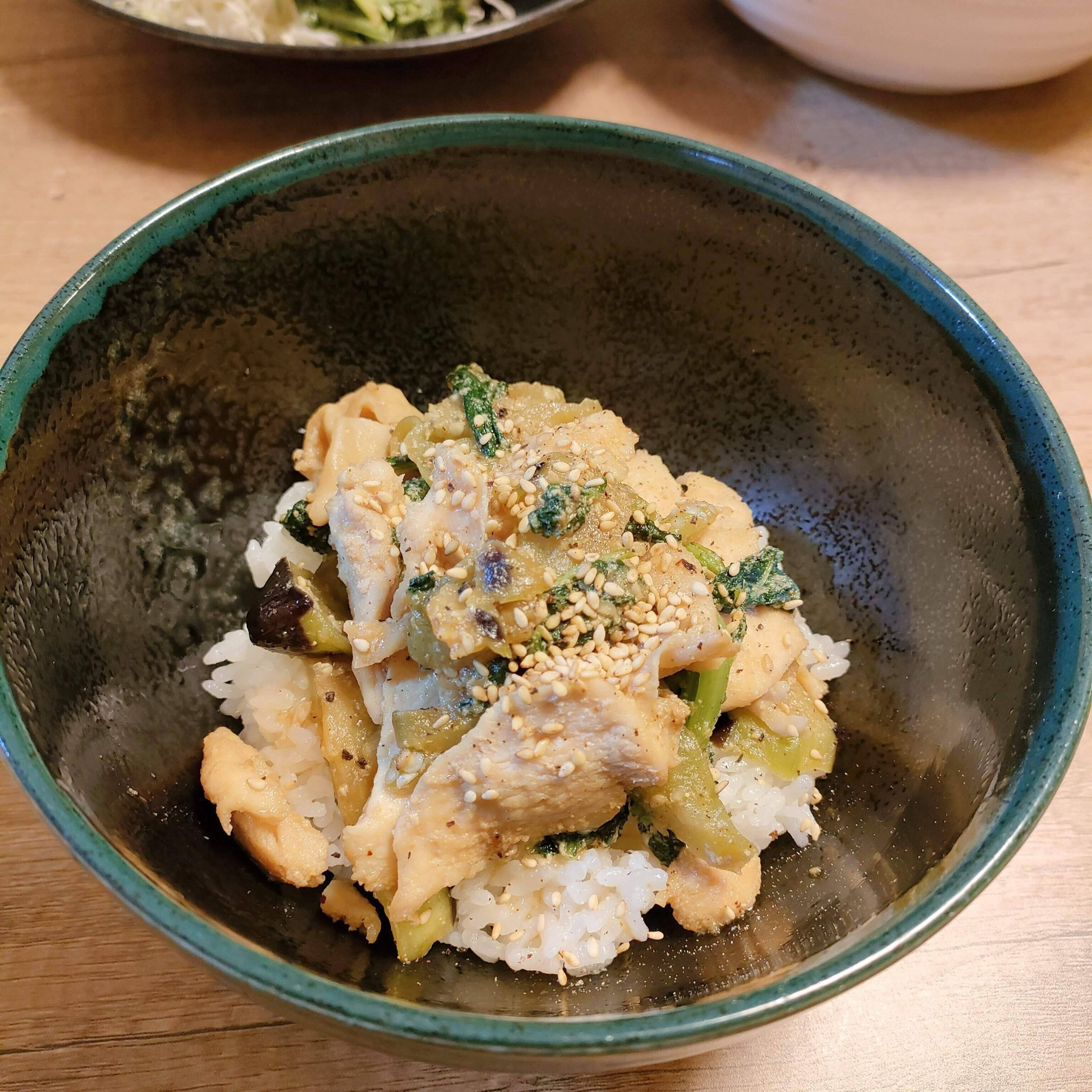 仕上げに白ごまをかけて、「茄子と鶏肉のバカッタレ丼」の出来上がり〜!香りだけでも満足できそう!大人も子どももパクパクとあっという間に完食でした。