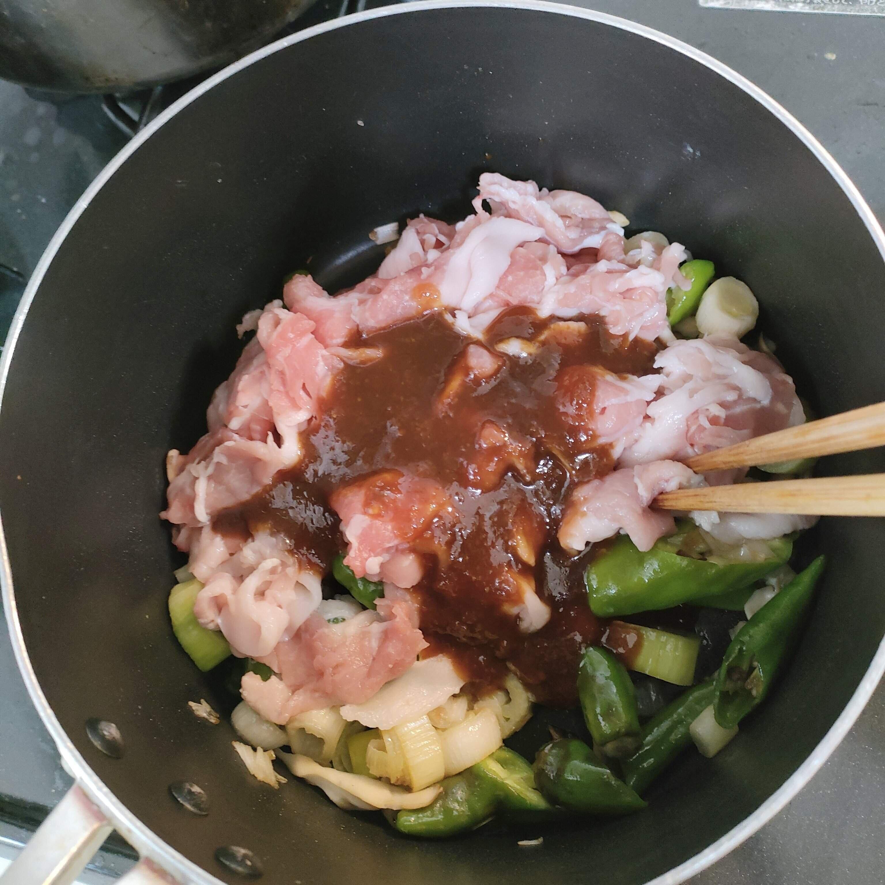 今回は、調理例にあった材料の長ネギ、甘唐辛子、舞茸、豚肉にあわせてみました。どろっとした味噌のタレを材料に絡ませながら、お鍋でじゅうじゅうと火をとおしていきます。