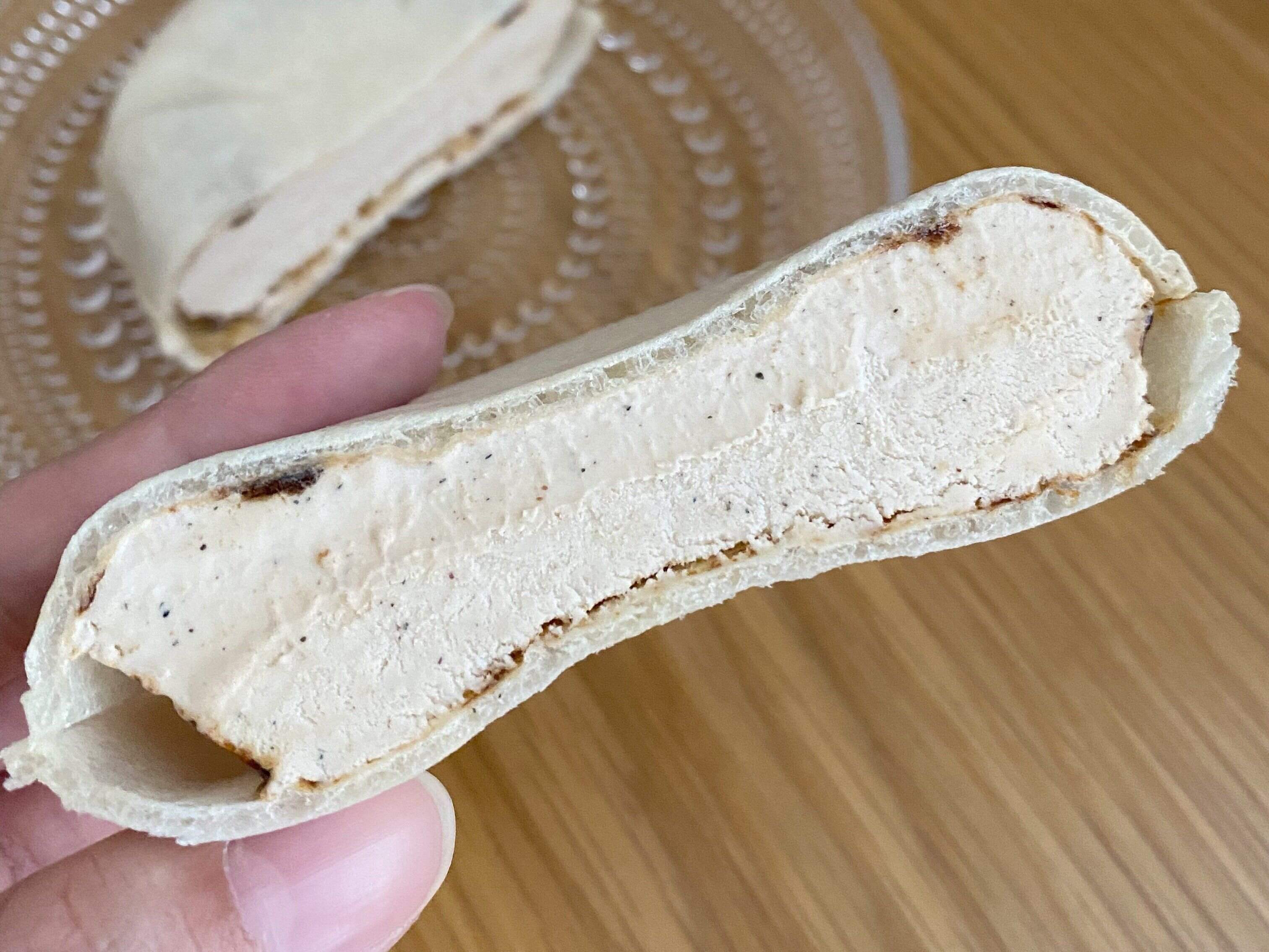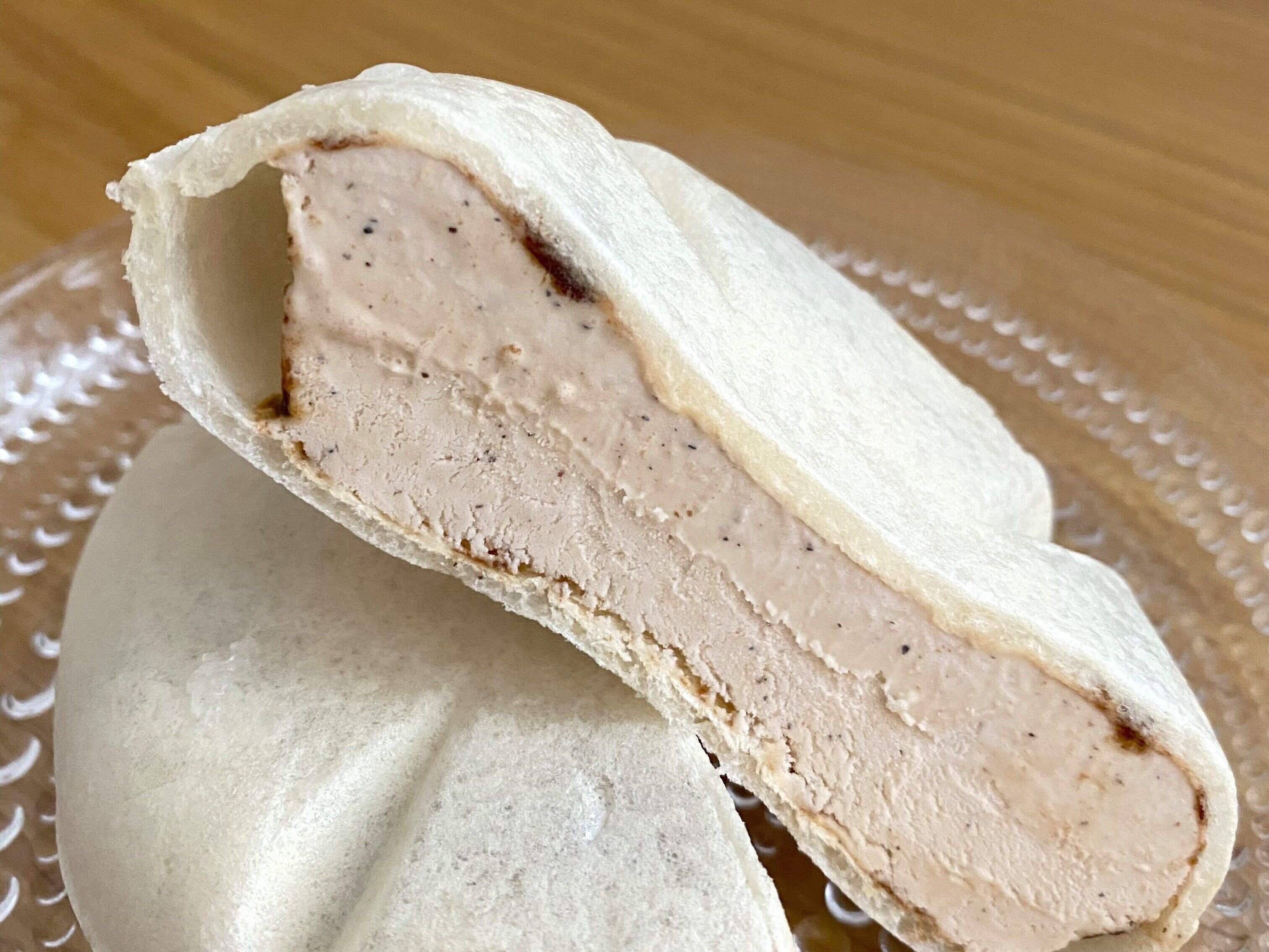 最中はしっとりモチッとした食感。きなこアイスはアイスクリーム(乳固形分15.0%以上、うち乳脂肪分8.0%以上)に分類されていることもあって、ミルク感やコク深さがあり舌触りもなめらかです。