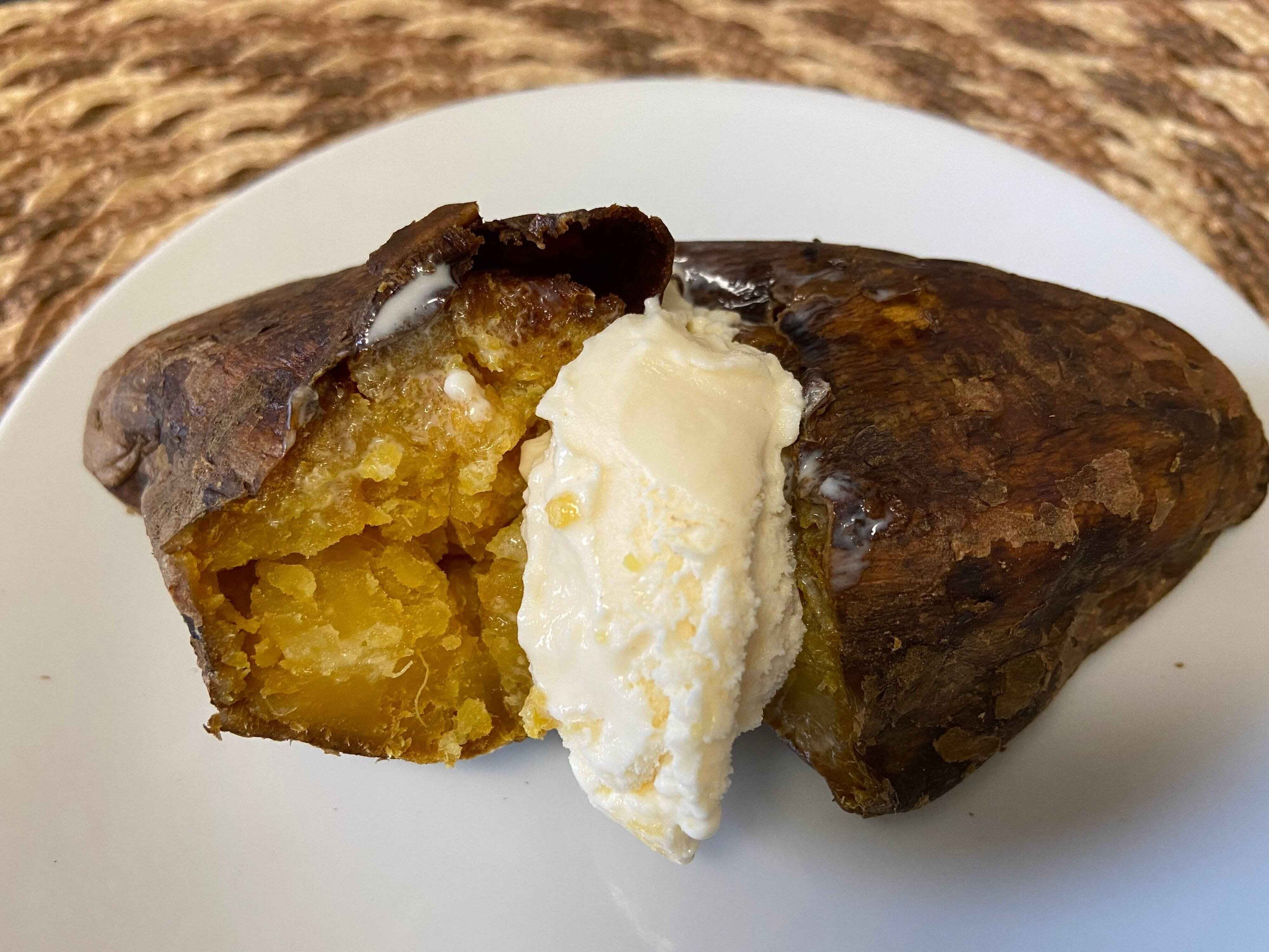 加熱後の焼きいもにバニラアイスをのせてみました。