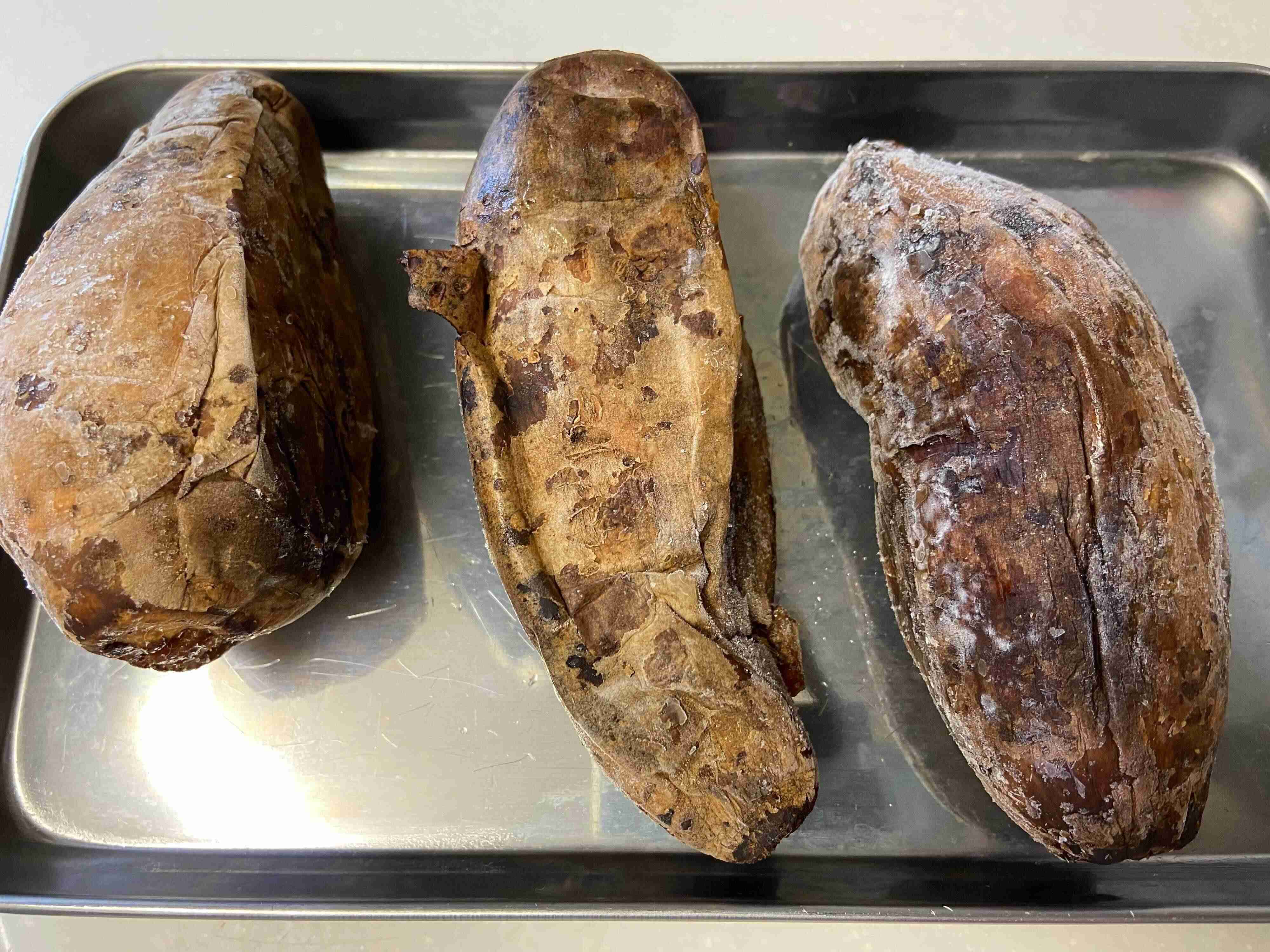 冷凍庫から出したてのカチンコチンに冷えた状態の焼きいも。サイズはさまざま、3個入りです。