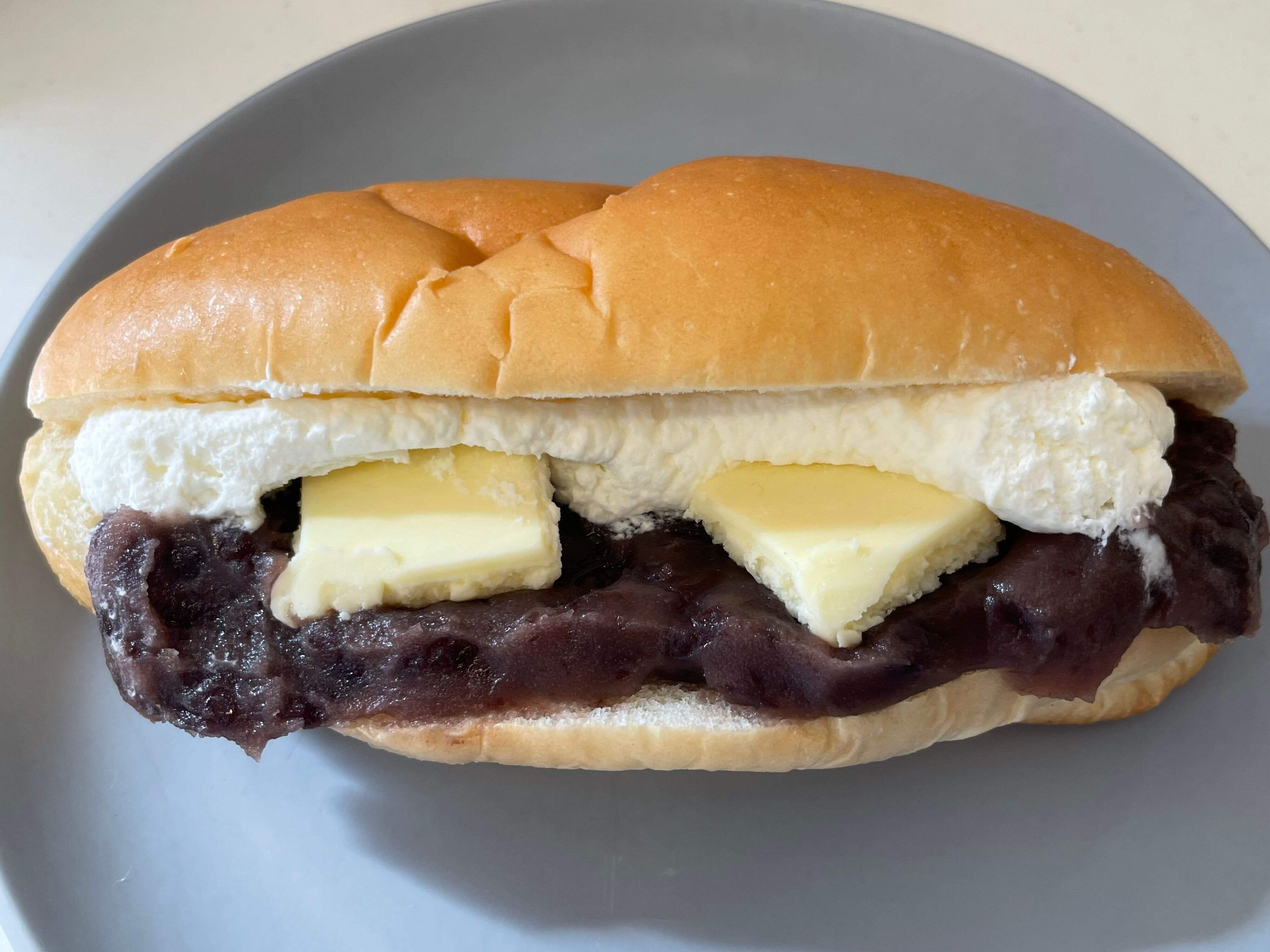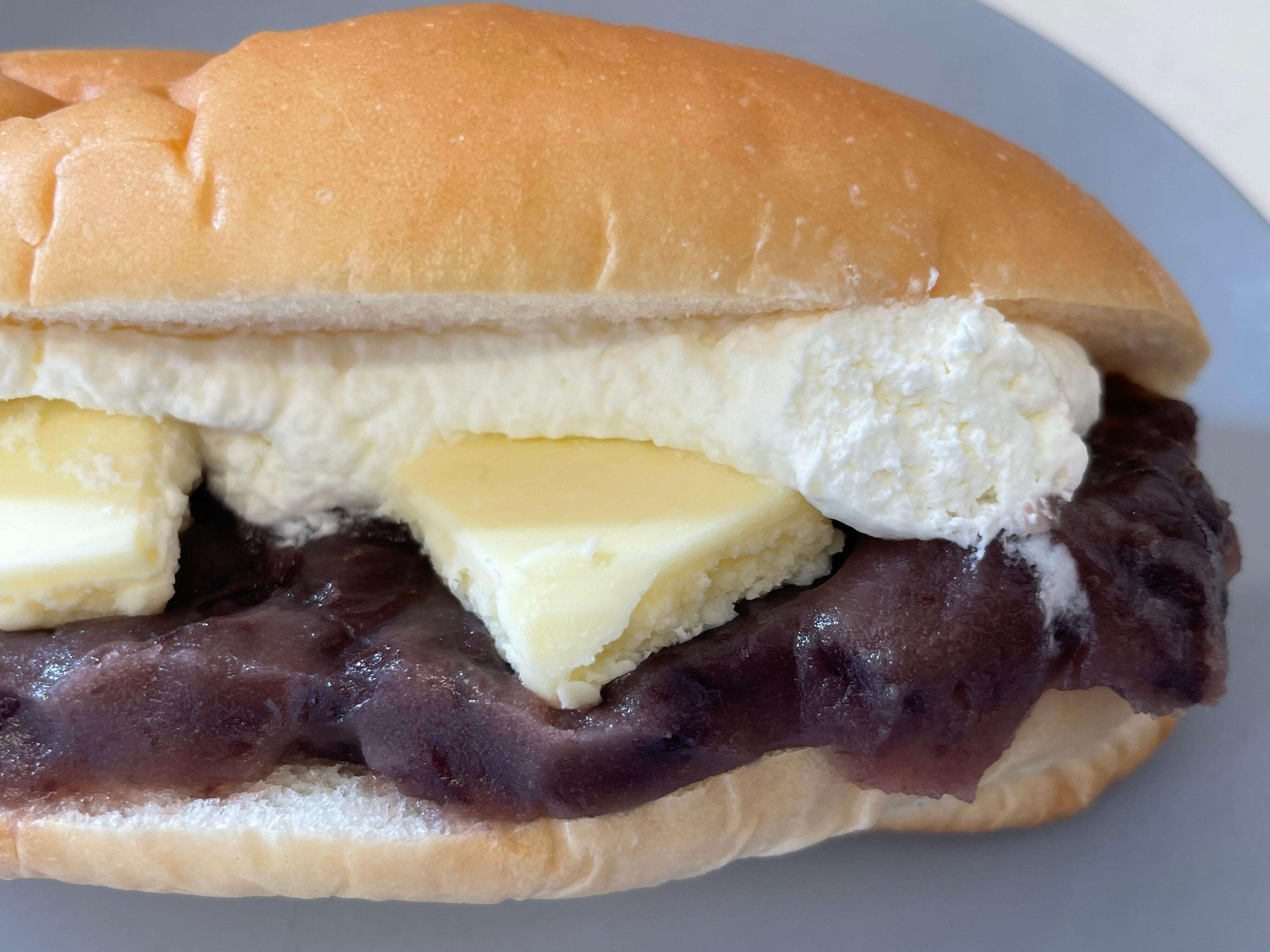 ふわっと軽くミルキーなホイップクリームと、こし餡にちかい餡は甘さ控えめで、バターは塩っ気はそこまで感じませんでした。餡がねっとりとしていてホイップクリームに絡みつくのがいいですね。バターを固形のまま食べるのは苦手ですが、くどさがないので大丈夫でした。