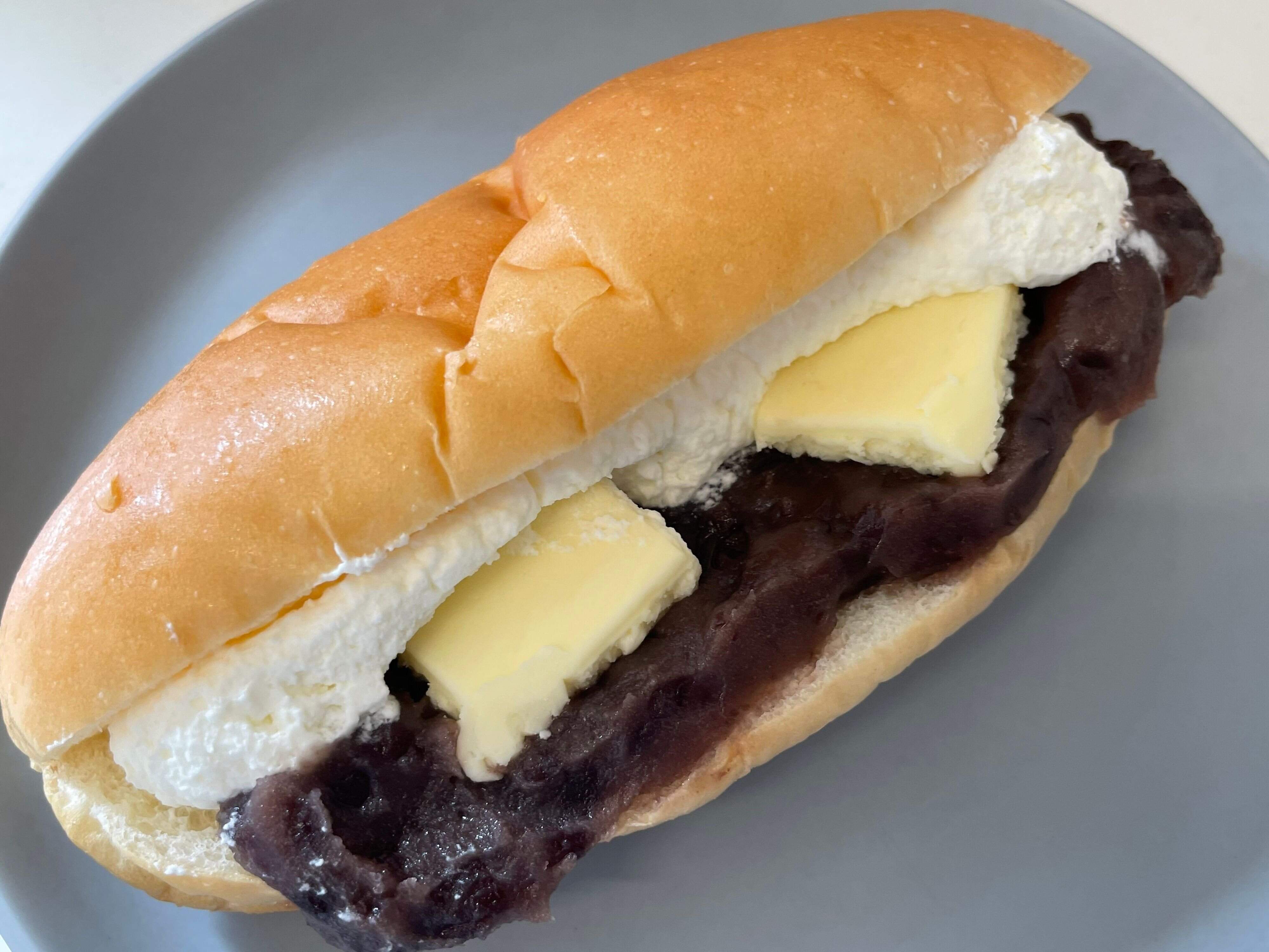 コッペパンに北海道産生クリーム、北海道産小豆から作った餡と北海道産生乳から作ったバターが挟まっています。