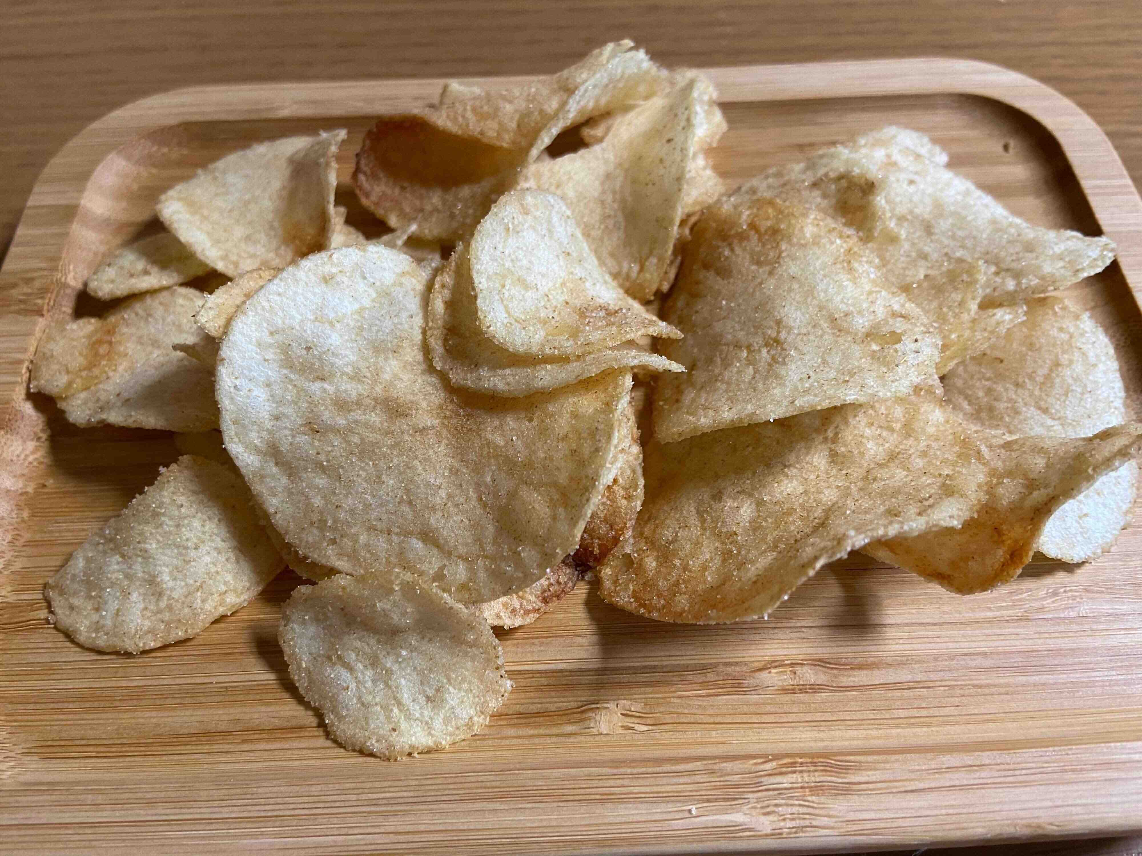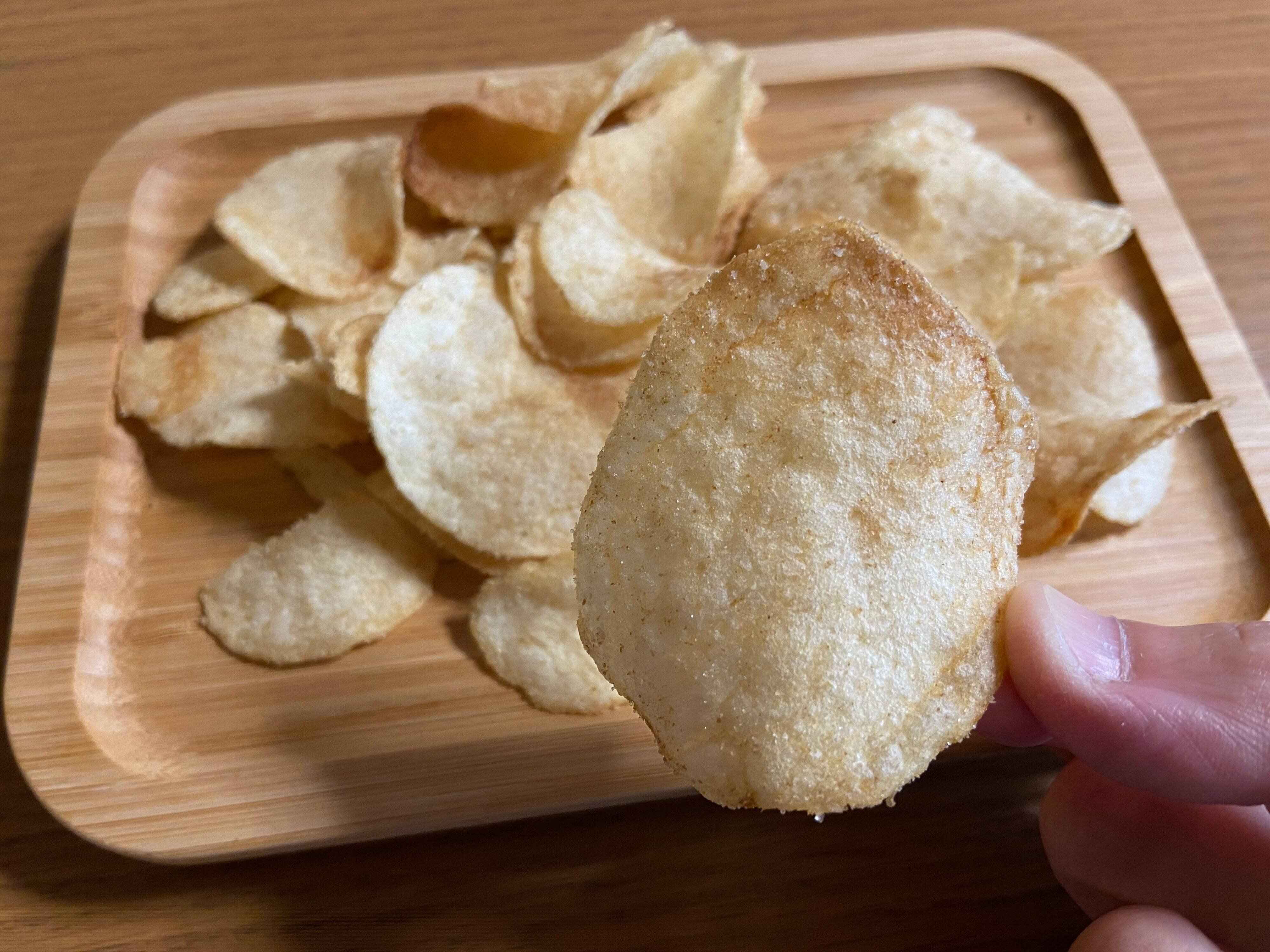 袋から取り出してみると、食欲をそそる、いい香りがします。パウダーがまぶされた薄いポテトチップスです。