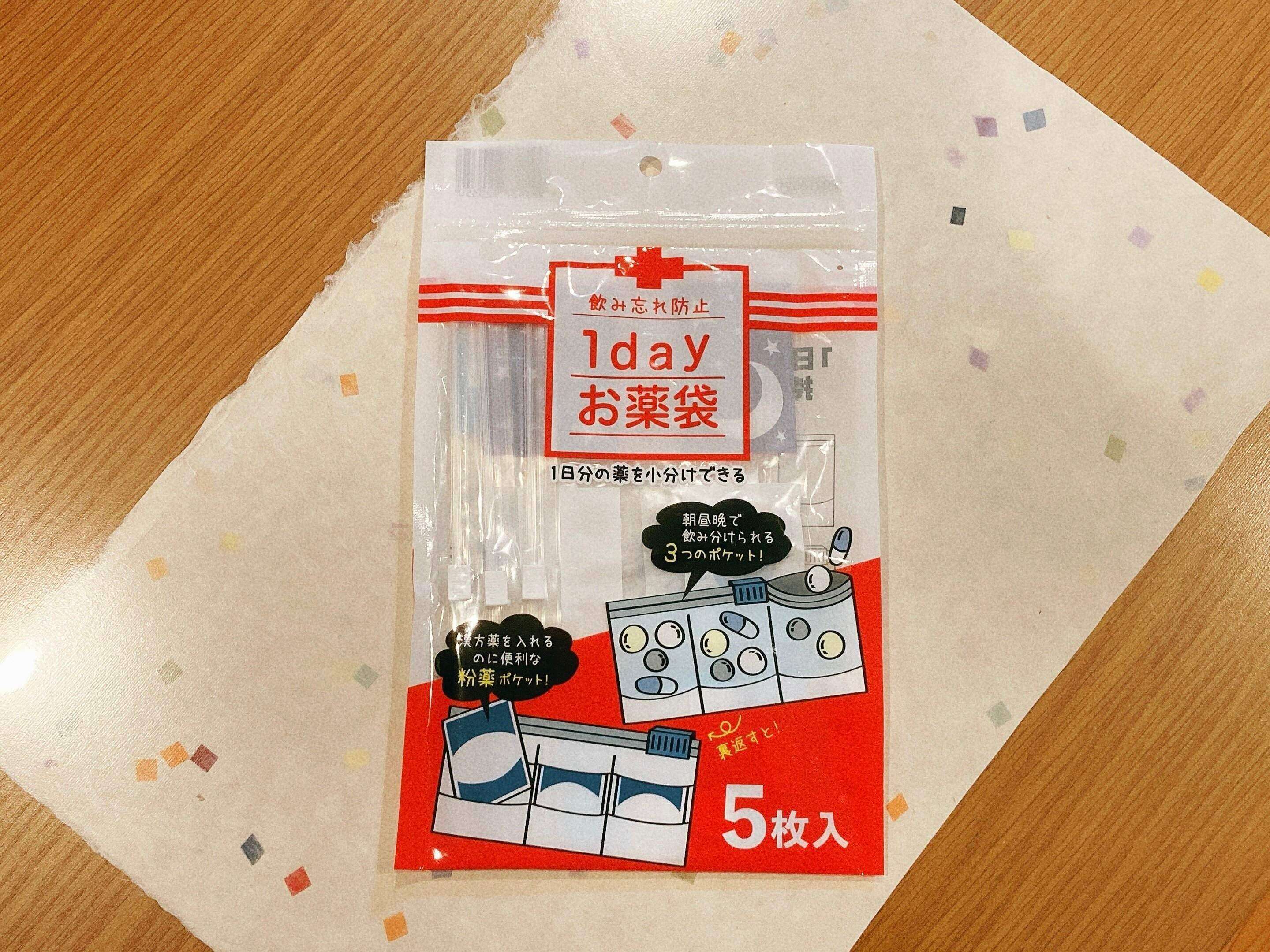 その商品とは、ダイソーの衛生用品近く、ピルケース売り場にて見つけた「飲み忘れ防止 1dayお薬袋」。まさに今私が求めているものでした。