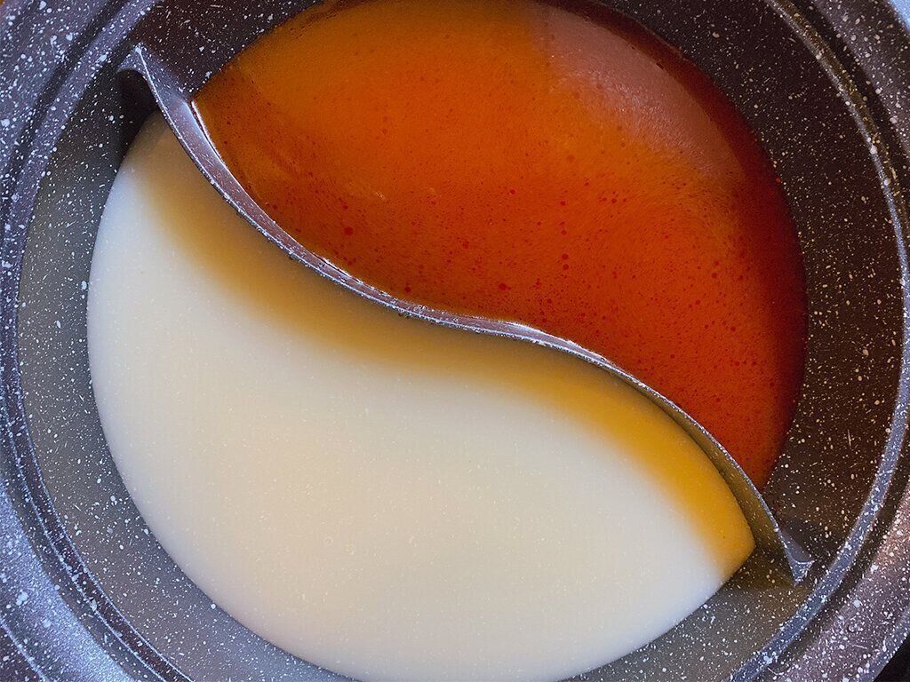赤い方がこの「旨辛鍋の素」を使ったスープです。