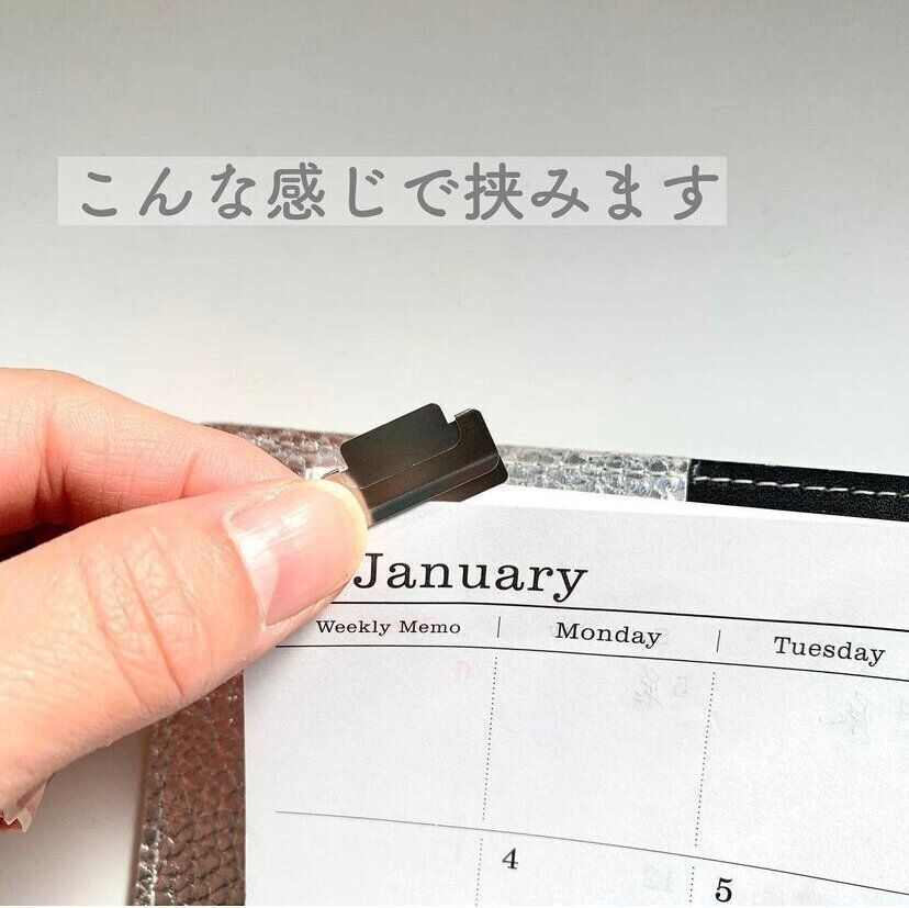 「チラットINDEXクリップ」は紙1枚がしっかりとまるクリップタイプのインデックス。マンスリータイプと同様、こちらも手帳カバーからはみ出ないので、使っているうちに傷むことも外れることもありません。また取り外しが自由にできるクリップタイプなので、日や週がかわるとインデックスも移動させることができます。