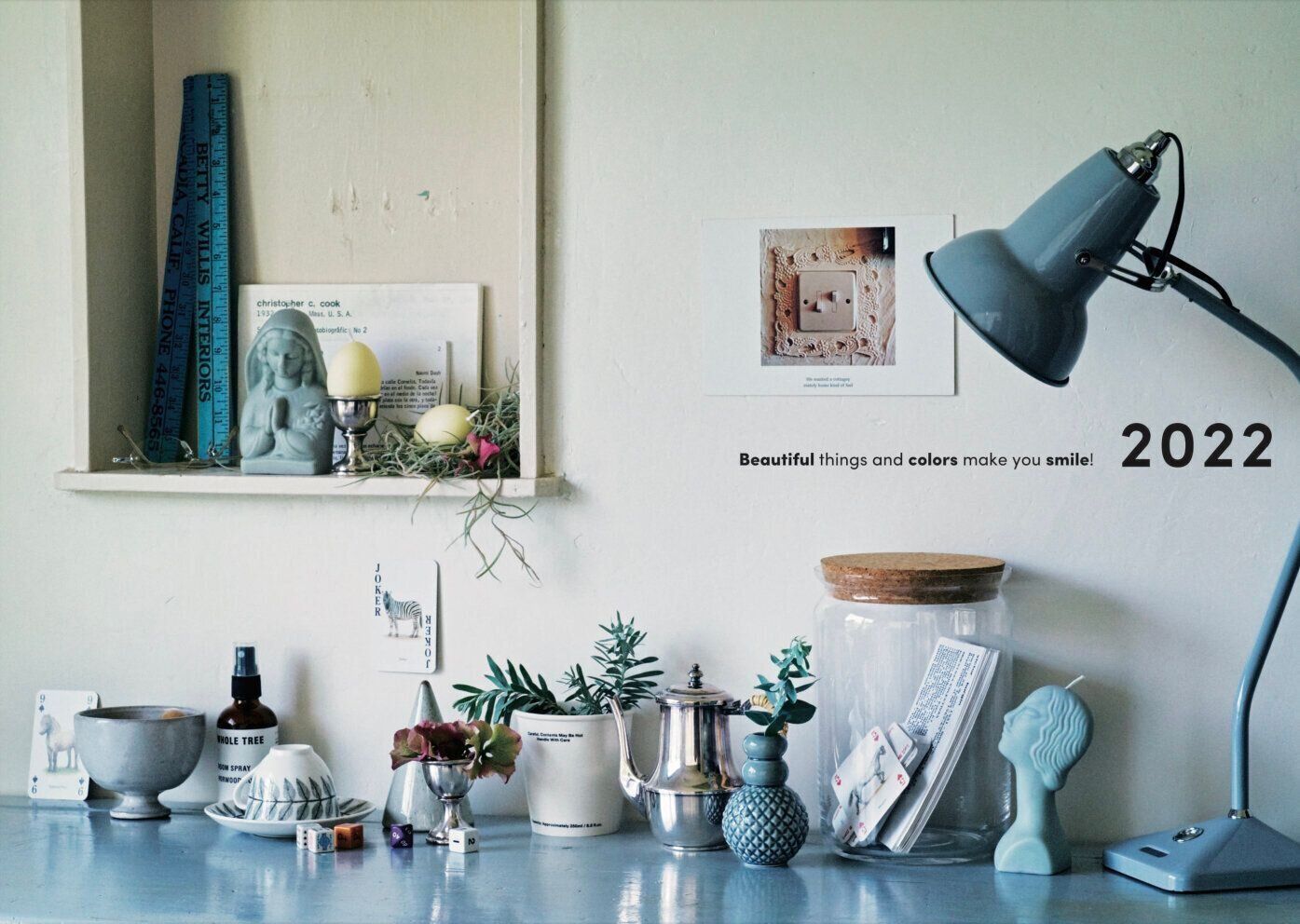 こういう色の合わせ方は、ぜひ取り入れたいところ。窓辺にただ立てかけただけのポストカードもかわいらしい。写真のなかをじっくりみると、実はたくさんのアイテムが隠れています。