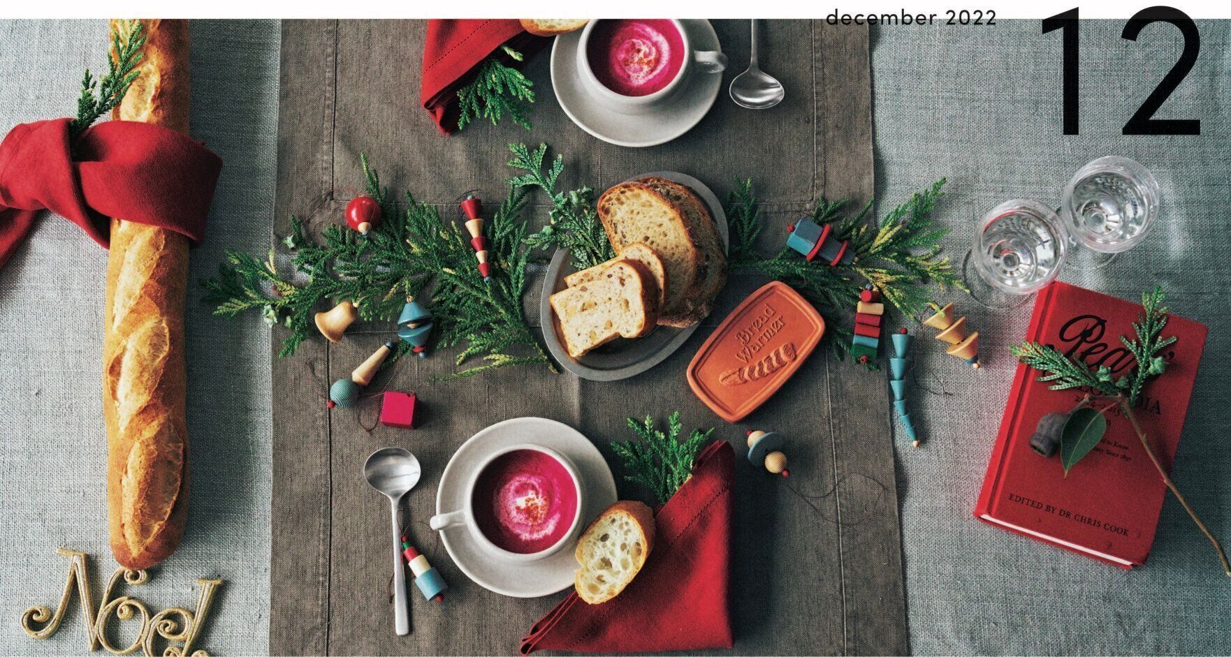 2022年12月の「クリスマスのテーブル」では、なんと、テーブルをツリーに見立てるという斬新なアイディア!木肌っぽい茶色のランチョンマットを敷き、そこにツリーっぽい植物やオーナメントを飾っています。
