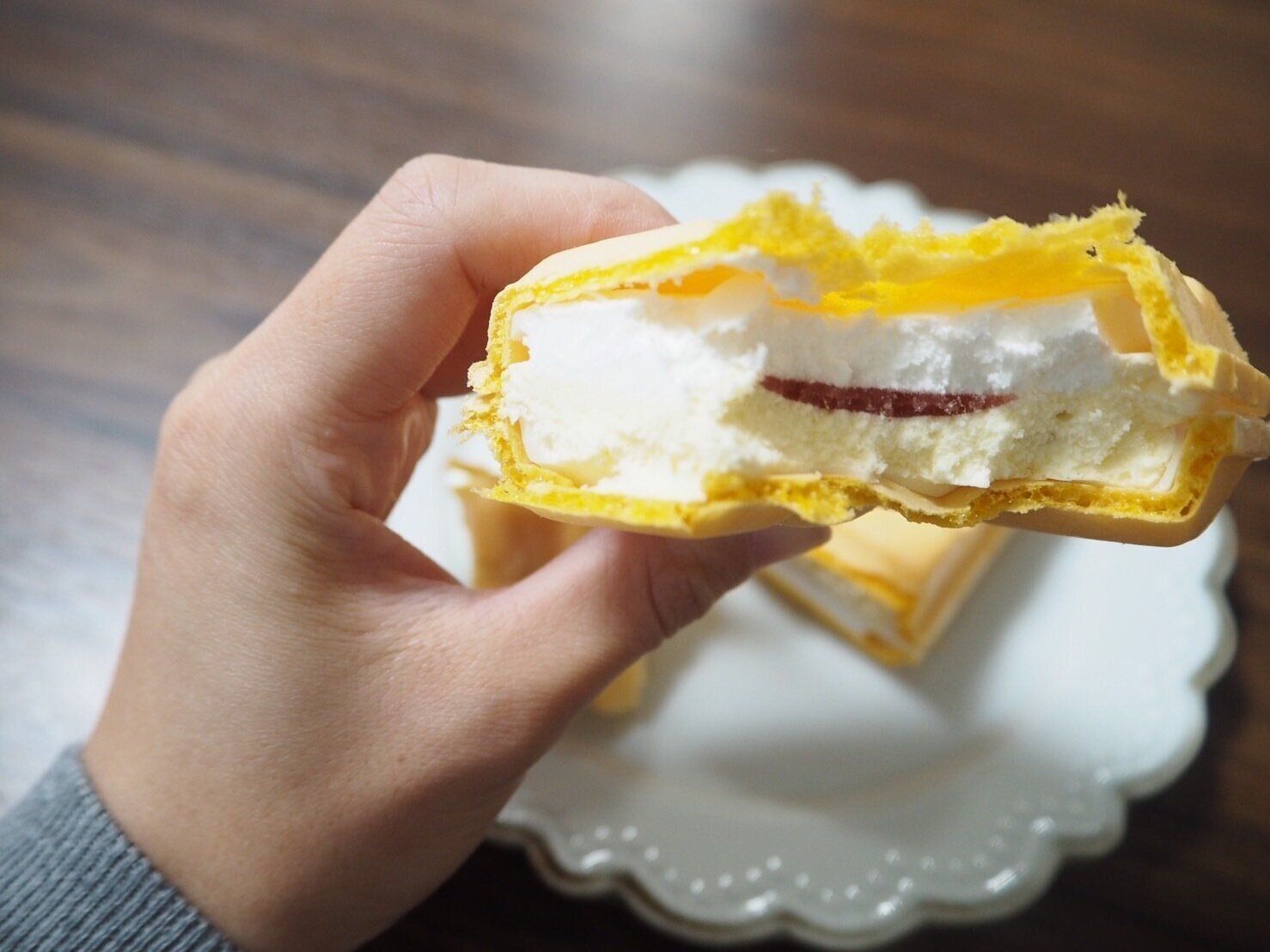淡い黄色のモナカに包まれたアイス。断面を拝見すべくカットしてみると・・・