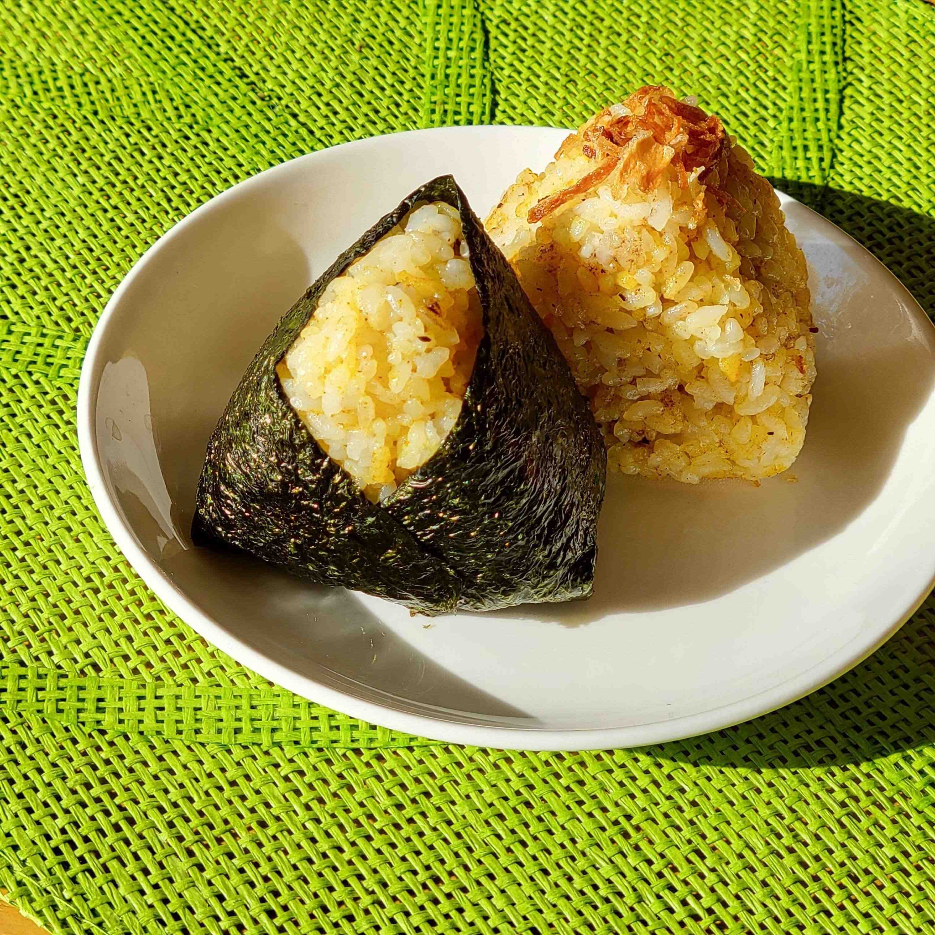 写真のおにぎりは、カレーパウダーとマキシマムナチュラルスパイスを組み合わせてごはんを炒めたもので、スパイシーなカレー味になります。