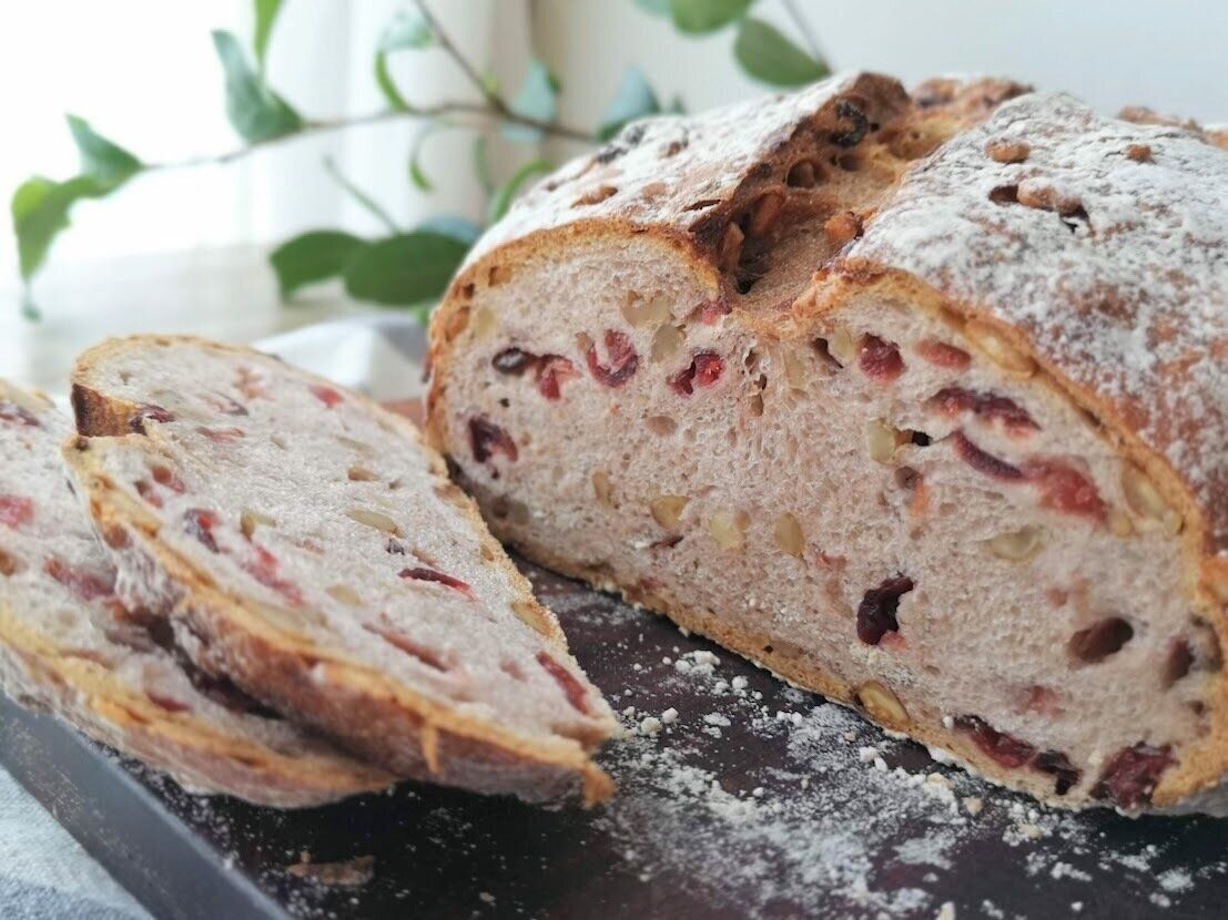 ライ麦を使った、どっしりと重たいハード系のドイツパンで、くるみとクランベリーをふんだんに使っています。