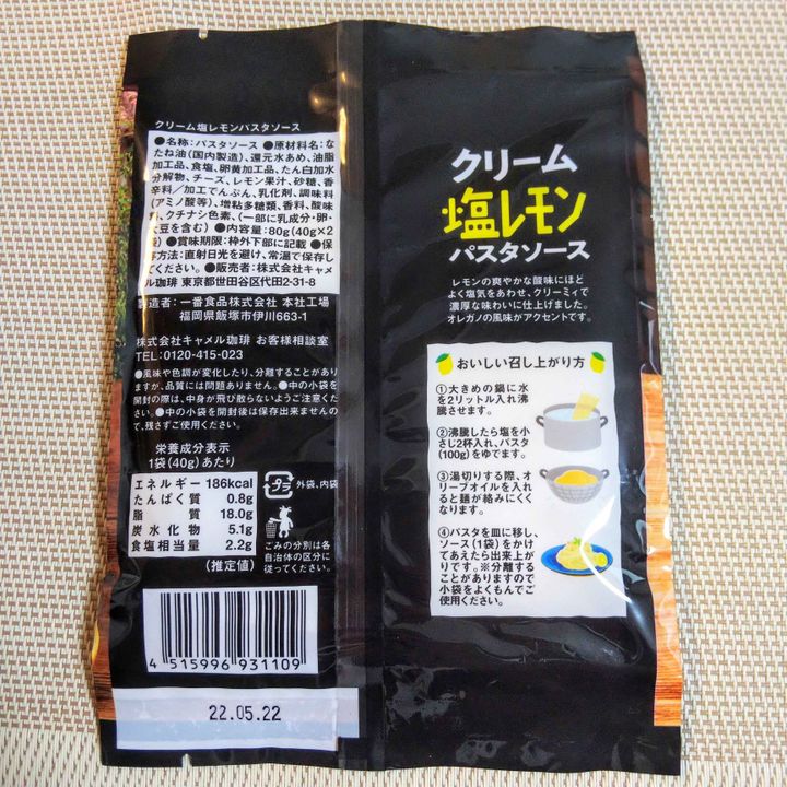 こちらの「クリーム塩レモンパスタソース」は171円で2人前になっています。カルディのレモン推し商品は以前から定評がありますが、こちらの商品も唸るほどの名品。