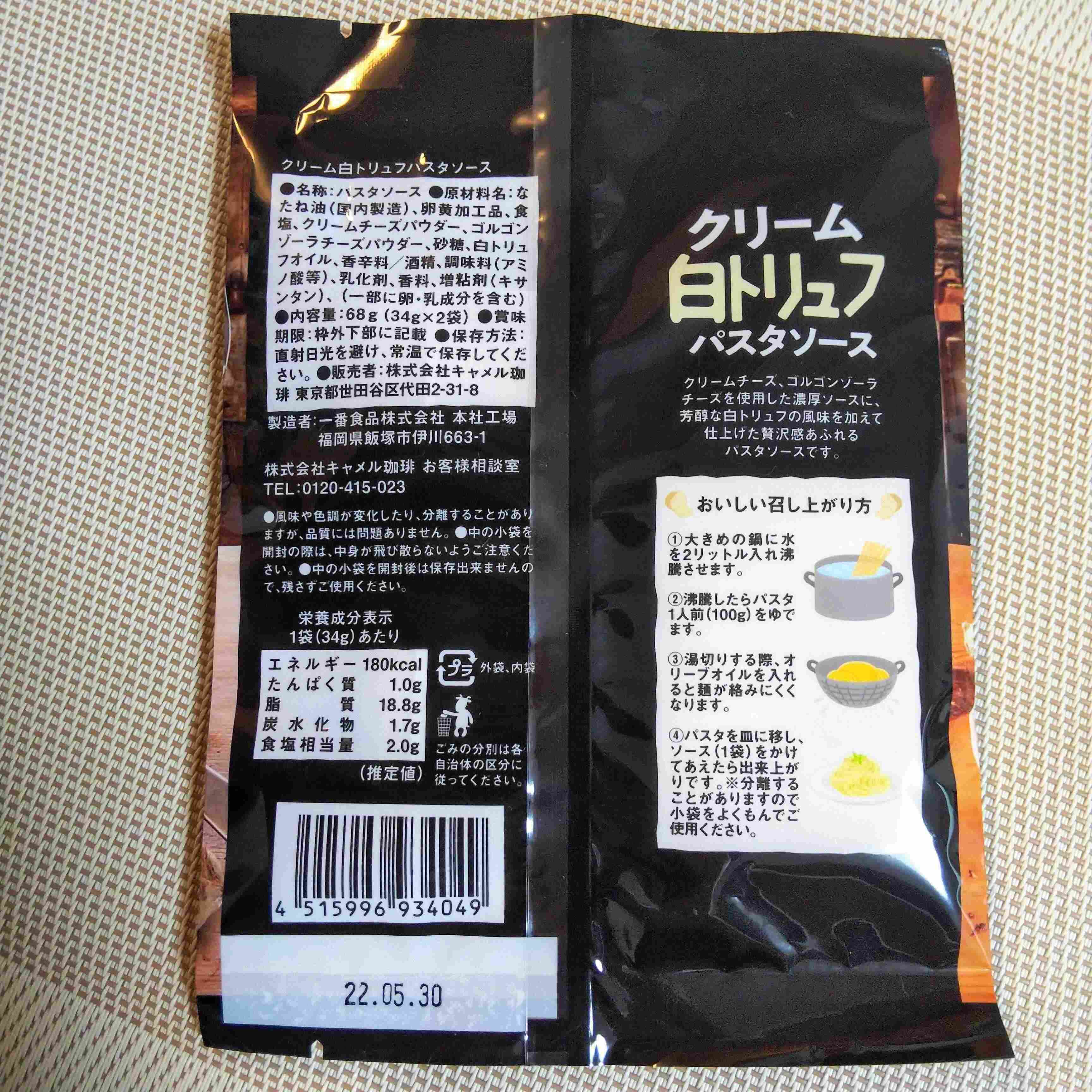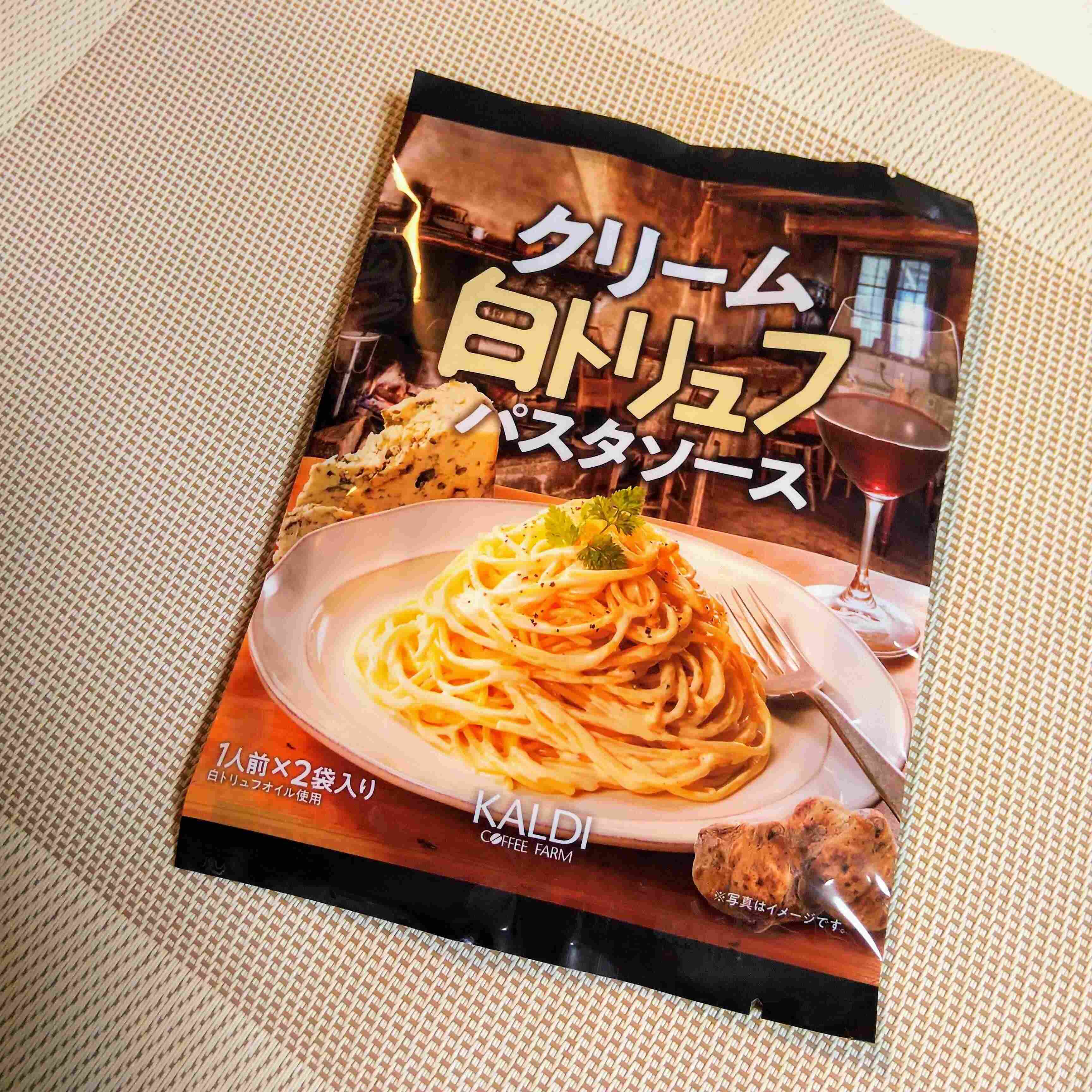 1食100円以下で本格トリュフが味わえると評判のアイテムは、「クリーム白トリュフパスタソース」198円で、カルディオリジナル商品です。しっかりとしたトリュフの香りと、濃厚チーズ2種のマッチ度が100パーセント超え!