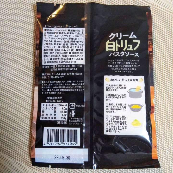 内容量は68g(34g×2袋)で、調理方法は茹でた麺にあえるだけなので、とても簡単に、本格パスタが出来上がります。