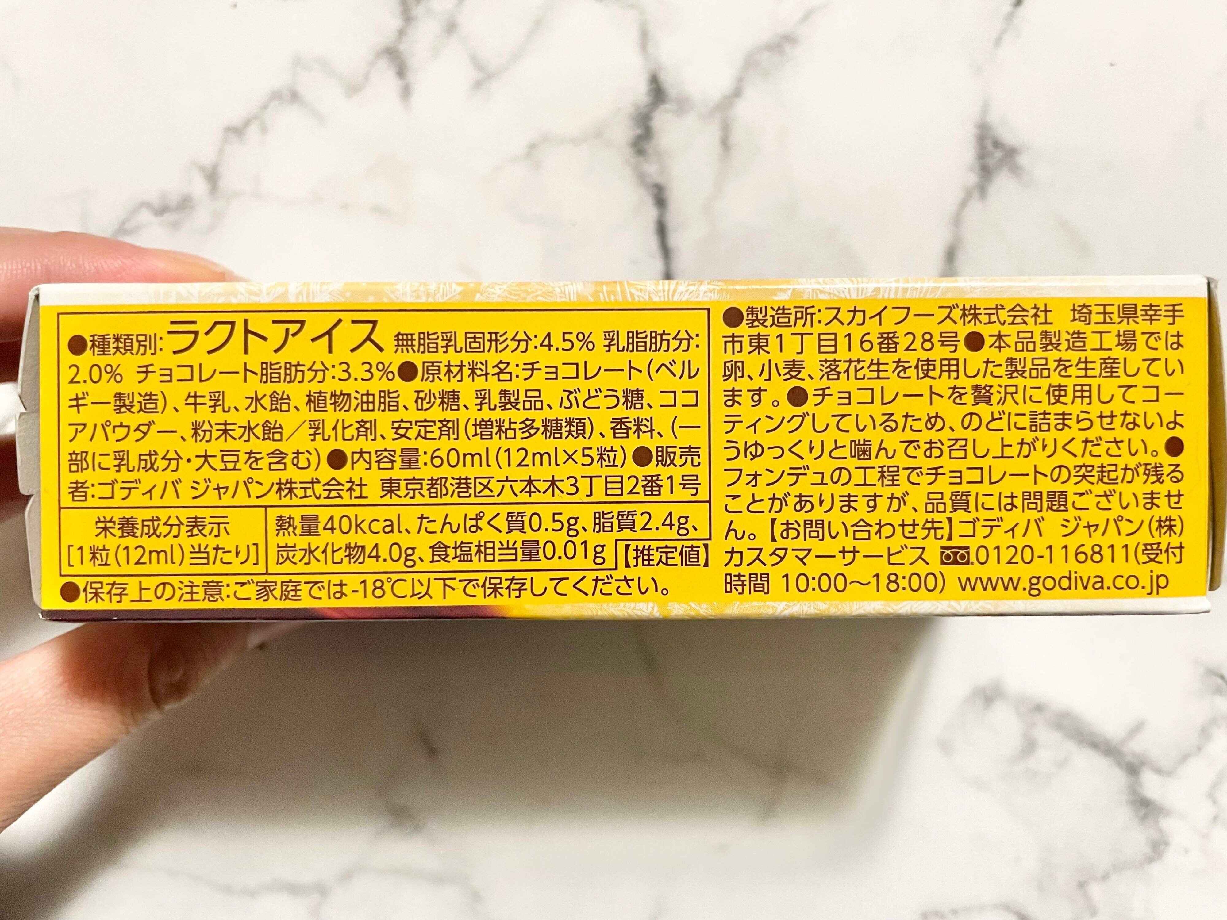 1粒あたり40kcalです。5粒入りなので、全部食べると200kcal。チョコレートだから高カロリーかと思いましたが、思っていたより低かったので罪悪感なく食べられます。