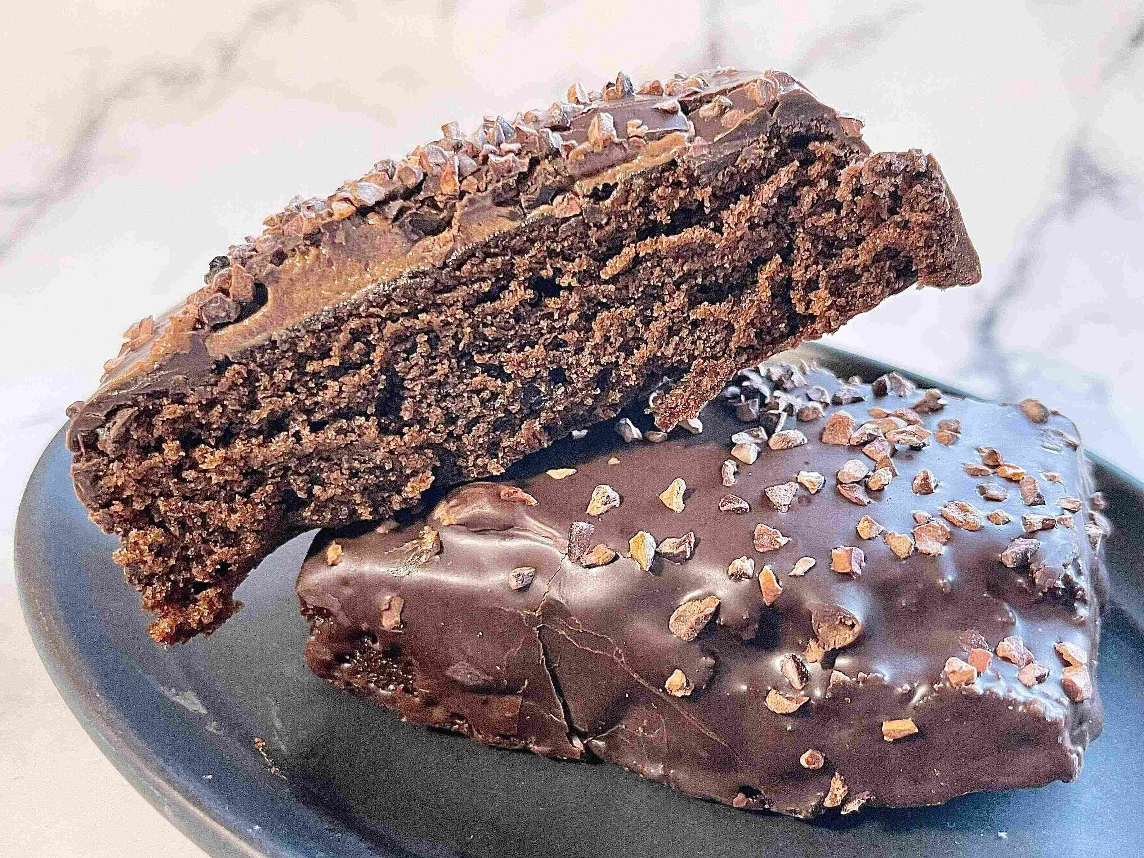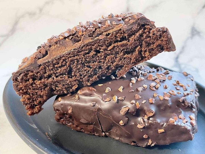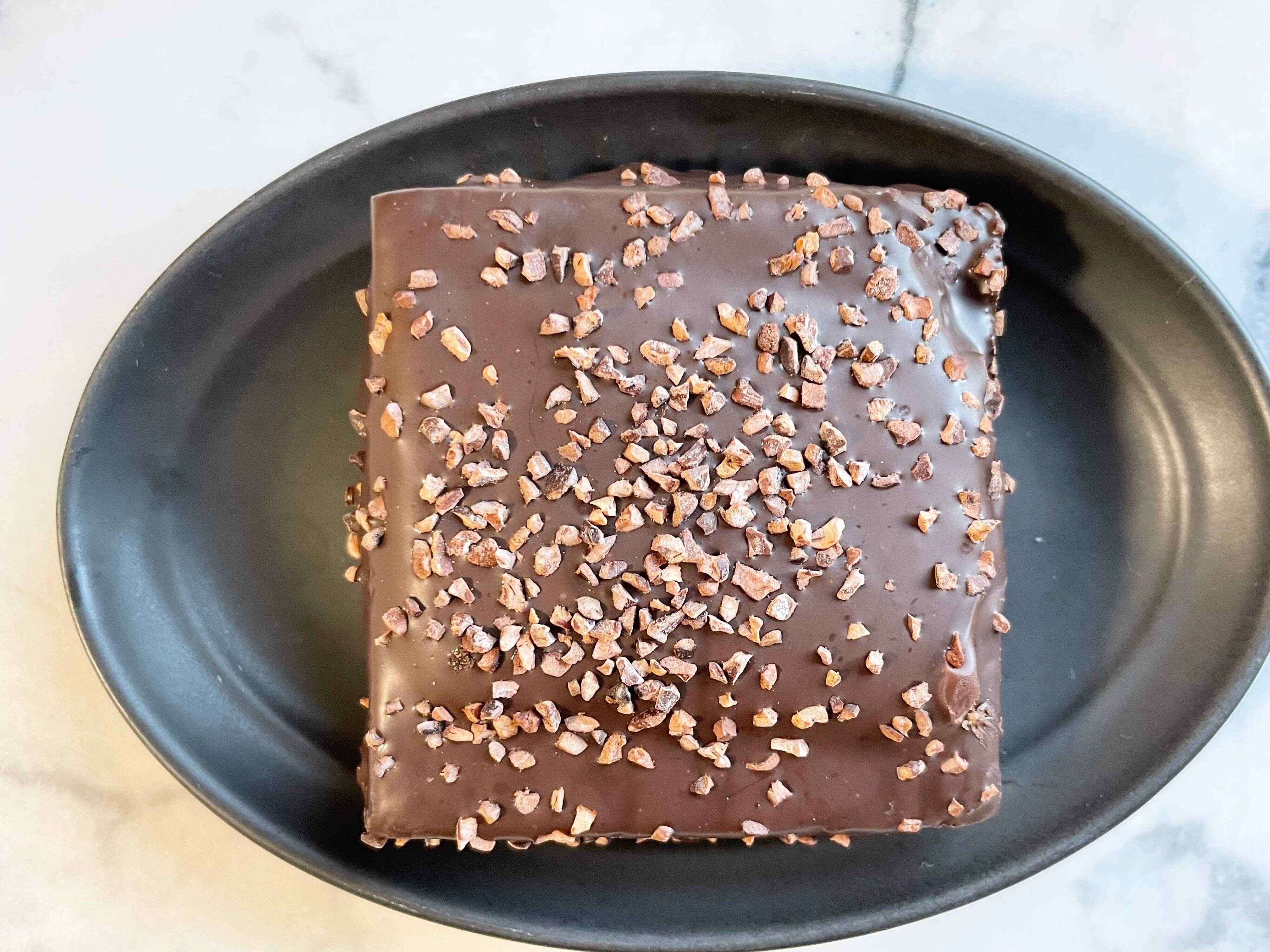 半分に切ってみると、思っていたよりしっとりとやわらかいです。ブラウニー、ジャンドゥーヤ、チョコレートと三層になっているのがわかります。