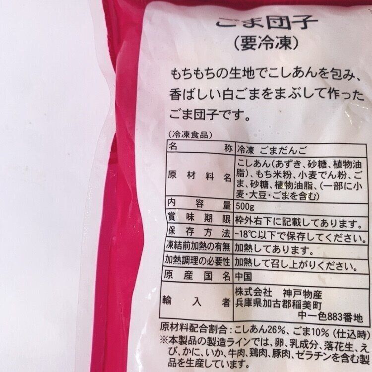 原材料名:こしあん(あずき、砂糖、食物油脂)、もち米粉、小麦でん粉、ごま、砂糖、食物油脂(一部に小麦・大豆・ごまを含む)