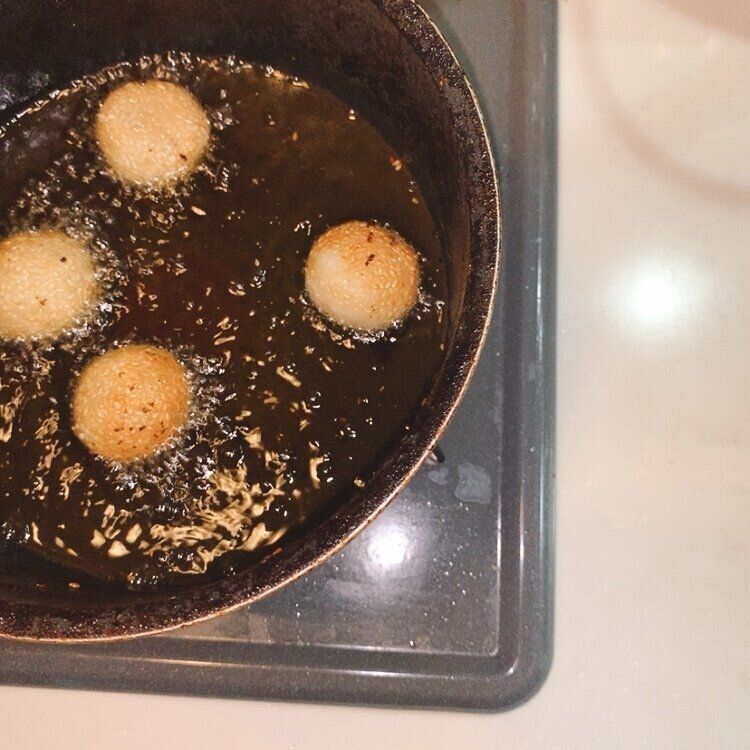 冷凍のままのごま団子を揚げるだけ。揚げたても冷めてもおいしいごま団子ですが、寒くなり始めた時期からは揚げたてをフーフーしながら味わってほしいですね。