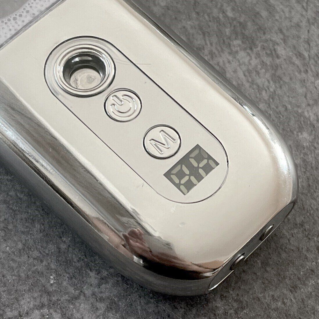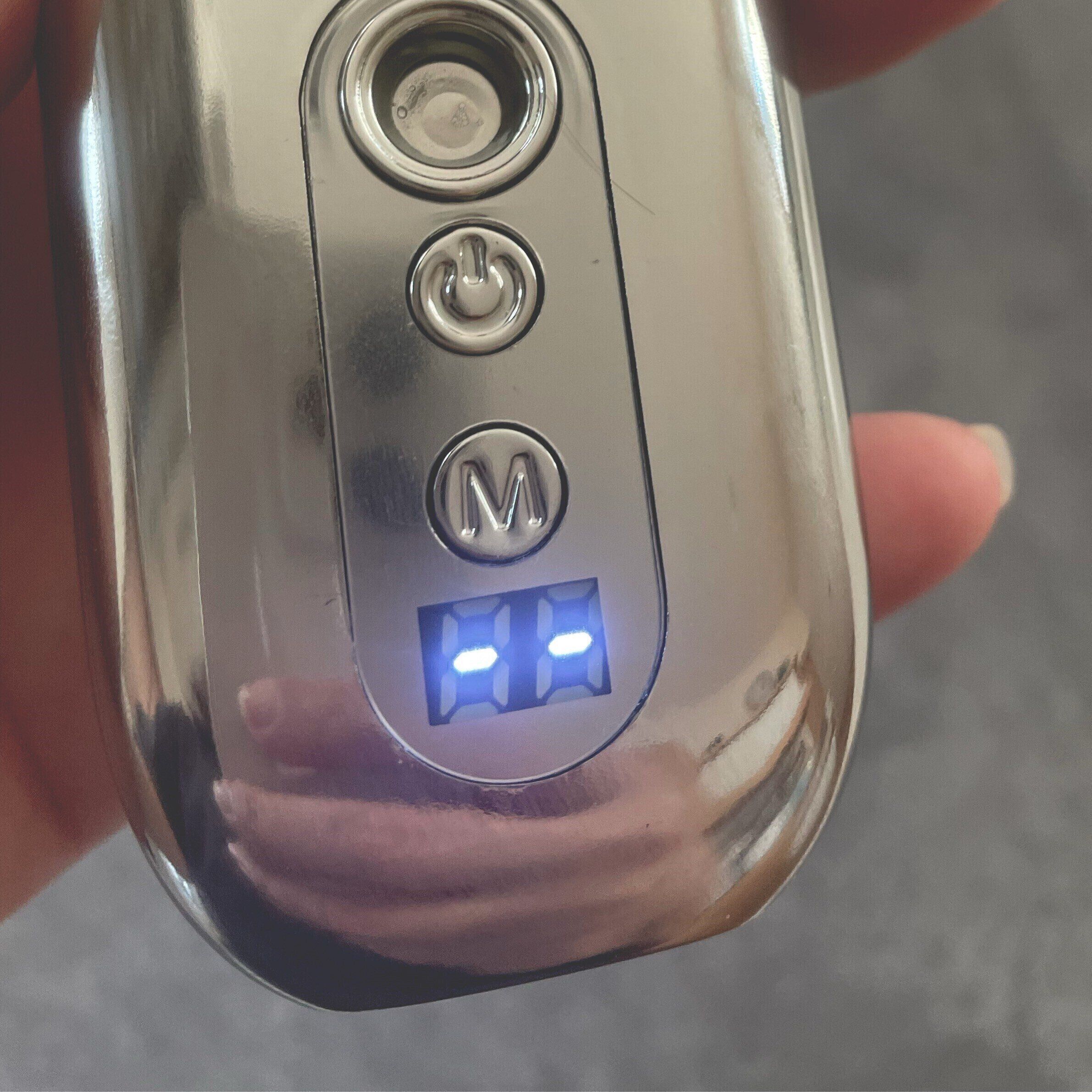 Mのボタンを押すと一番下の数字表示部分がこのように青く光ります。本体底にある測定部分を肌に当てて5秒待つと水分量が表示される仕組みです!