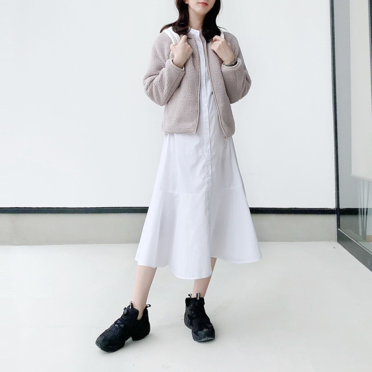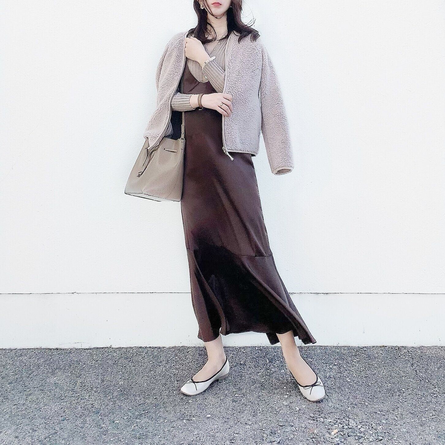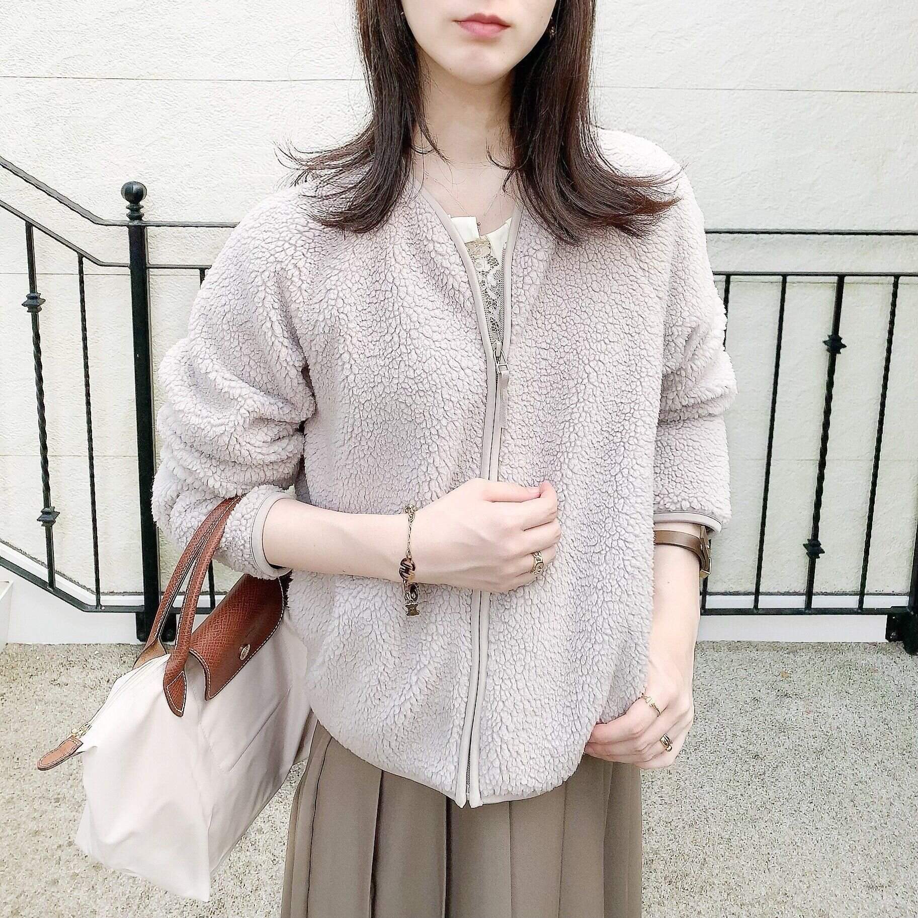 この時期、ワンピースだけだと寒いことが多いので、フリースがあると気軽に着られていいですよね。カラーもどんなコーデにも合わせやすいので助かります。