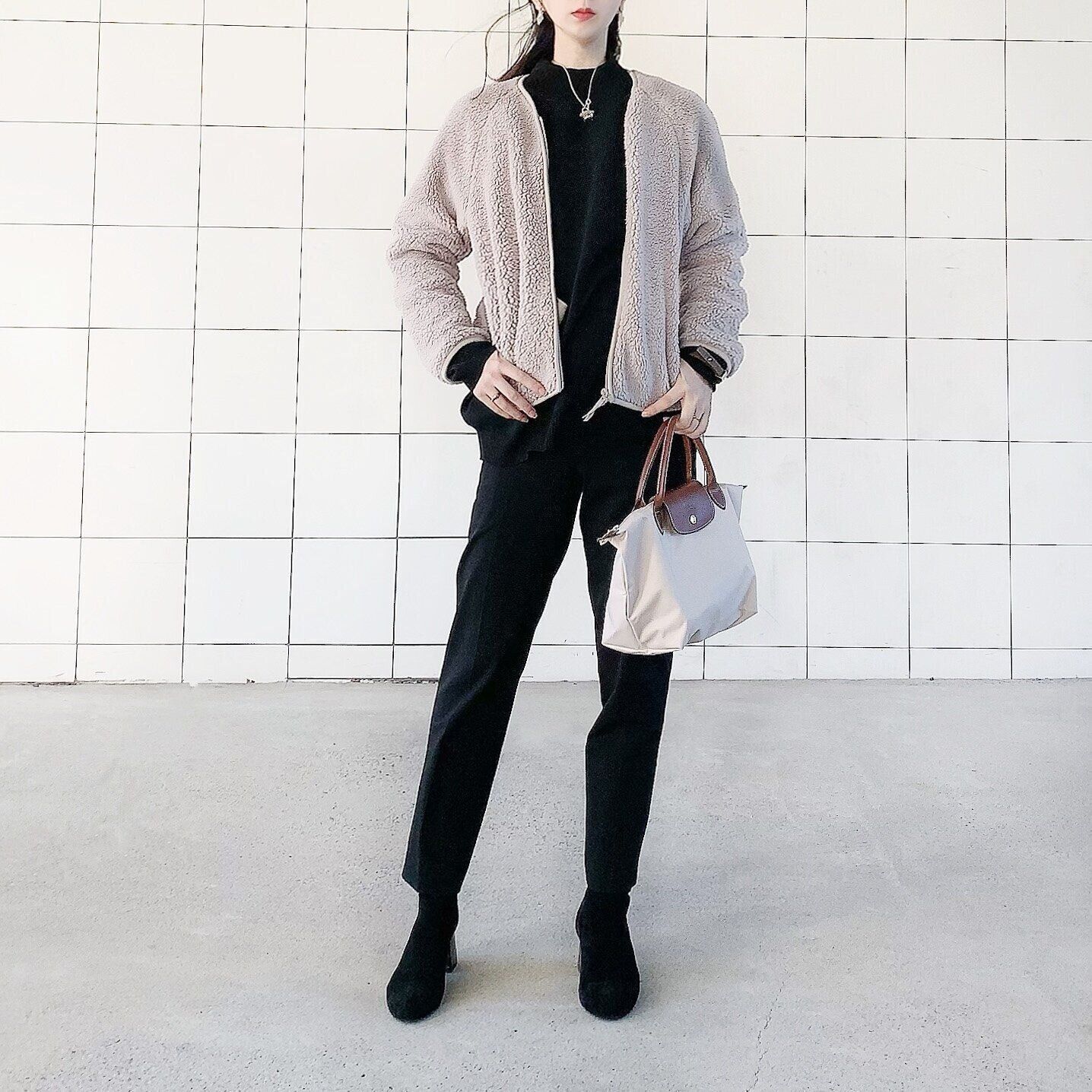 続いてはブラックコーデに合わせたこちらのコーデ。カチッとしすぎ感をボアフリースがいい感じにカジュアルにしてくれます。