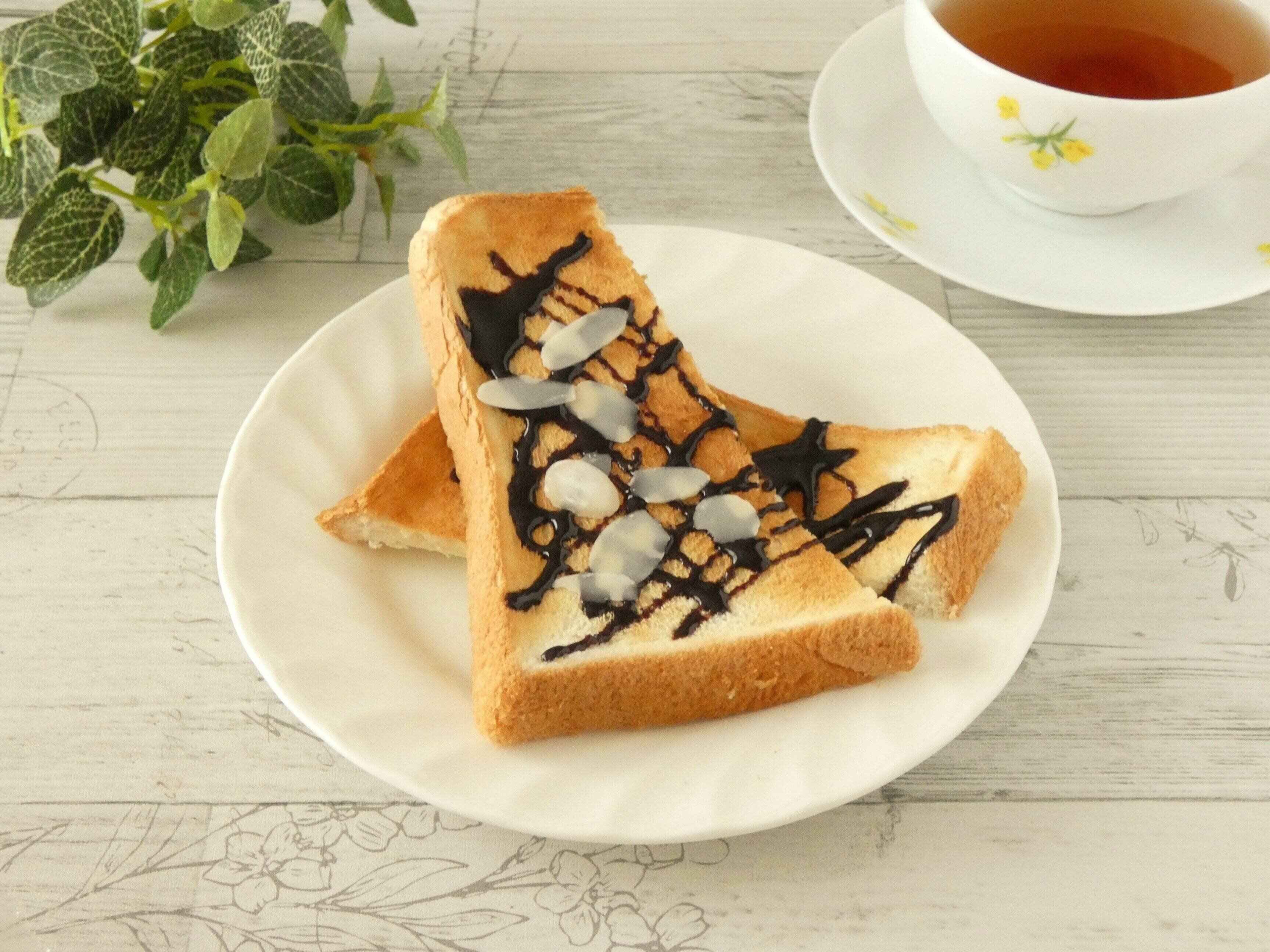 トーストにチョコレートソースをかけるだけで、簡単スイーツパンになります。お好みでナッツやドライフルーツをトッピングするとアレンジを楽しめます。