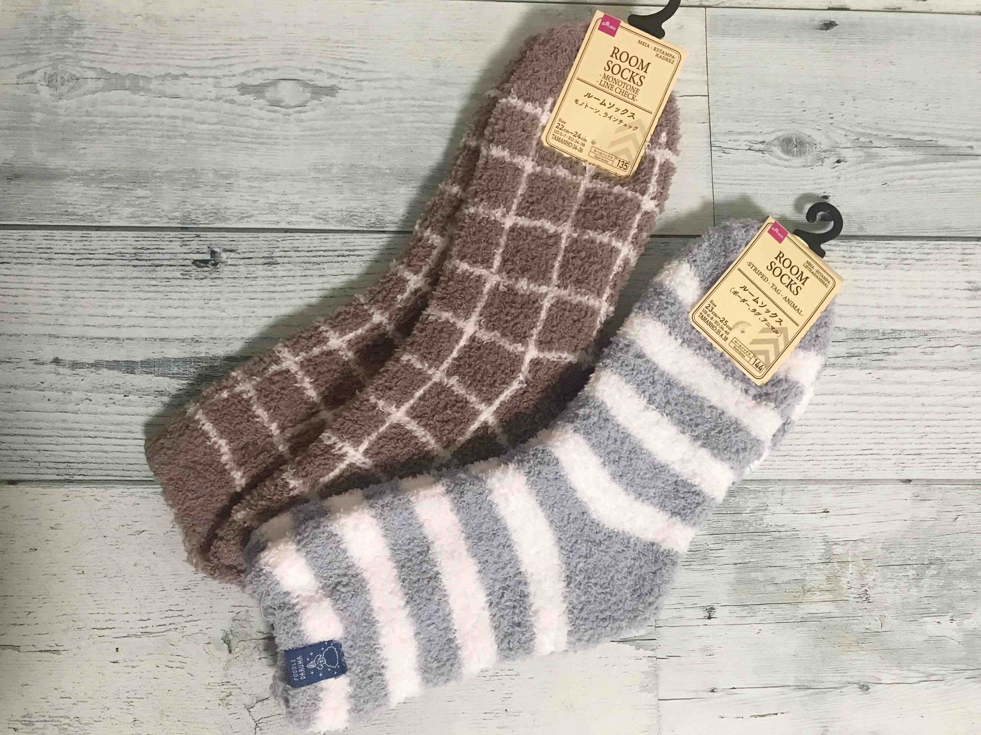 買い足しアイテム1つめが「ルームソックス」(各110円)。もこもこで履くだけで足の末端の冷えを緩和してくれるルームソックスは毎年欠かせないアイテムです。