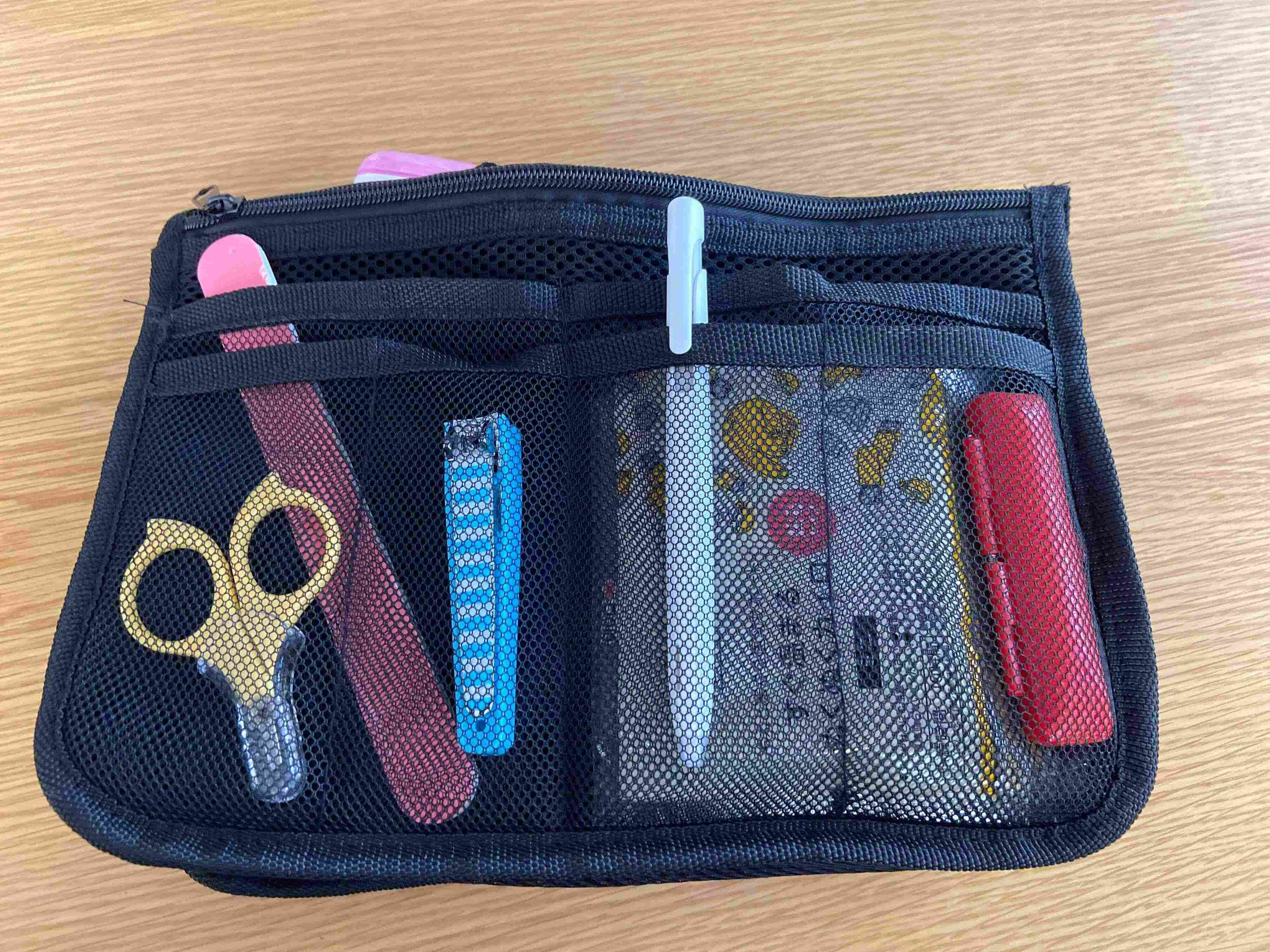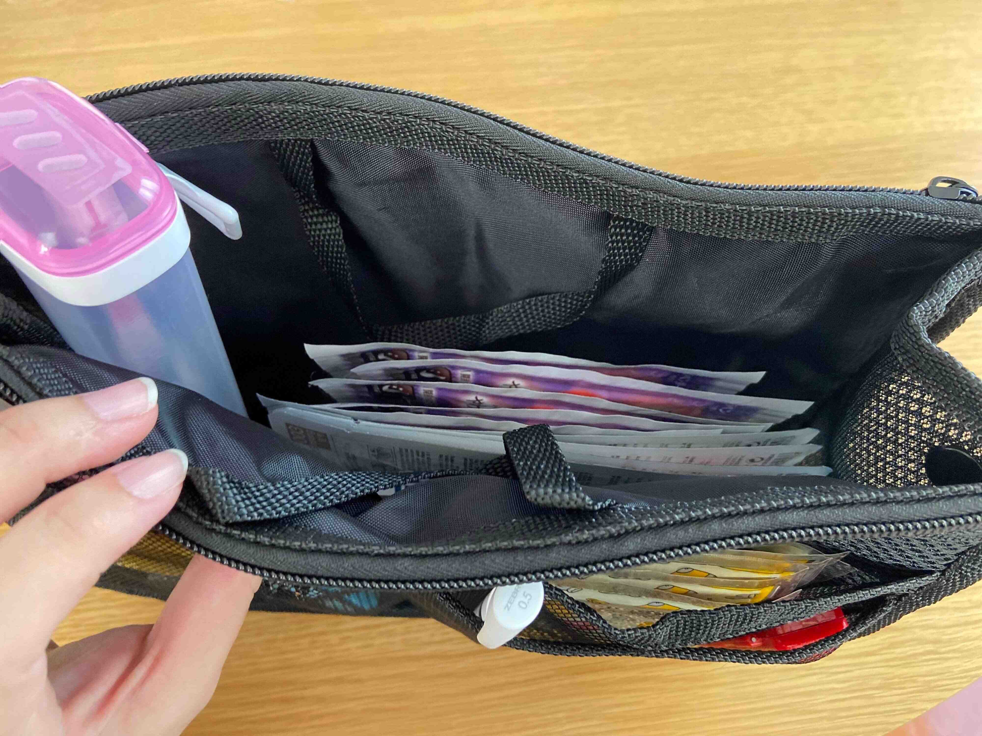 ポケットがたくさんついているので、ものの定位置を決めてすっきりと収納することができます。筆者は出産を控えていたので、入院中に使用するものを収納してみました。