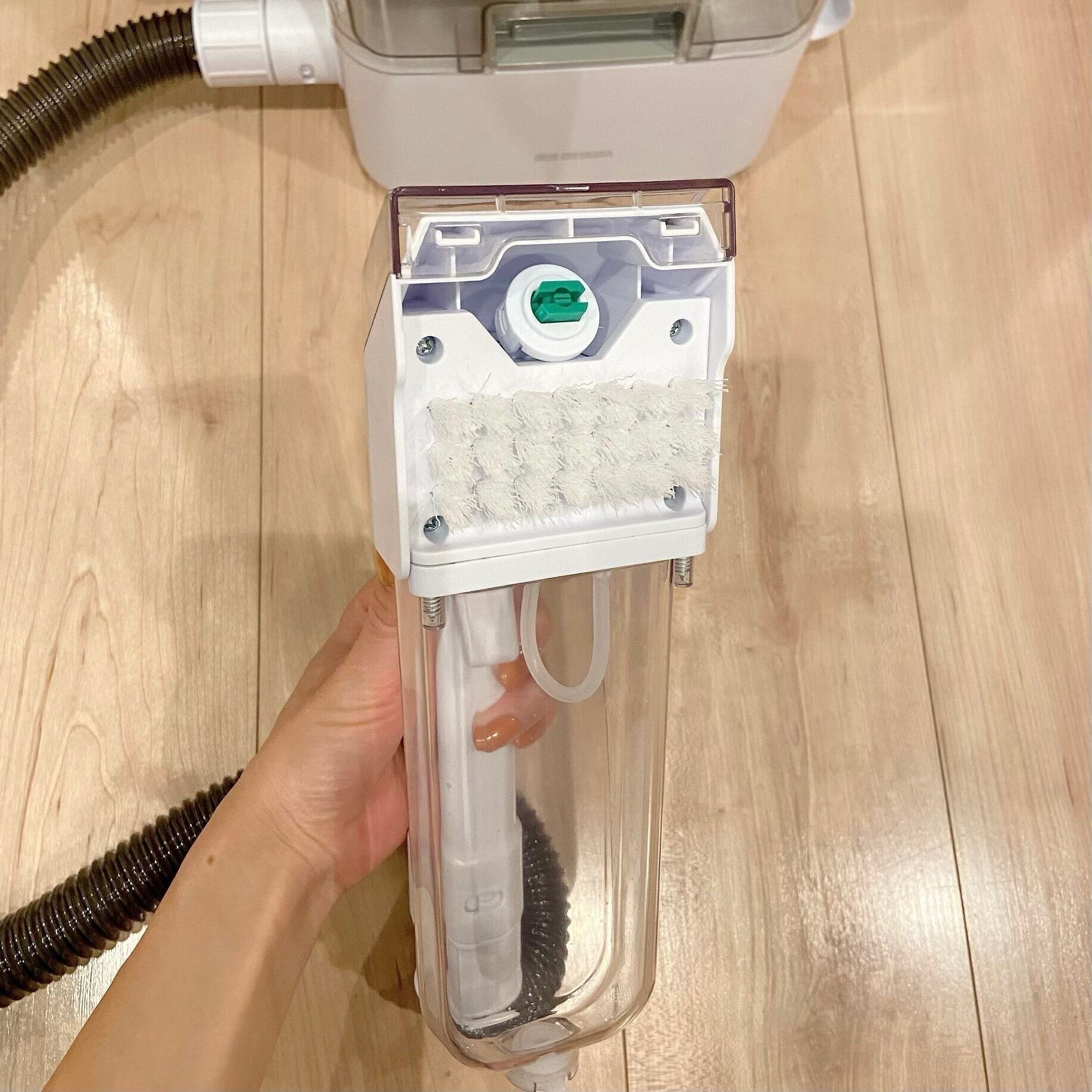 使い方はとても簡単です。タンクに水を入れバキュームホースに繋げたら準備は完了。洗浄ブラシ、ノズル、吸込口が一体になっています。噴出レバーを霧吹きの要領で引いて、水を噴出し汚れを吸い取るというシンプルな仕組み。パワフルに汚れを吸い取ってくれます。