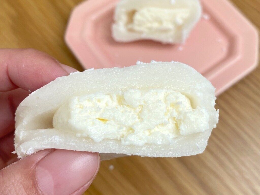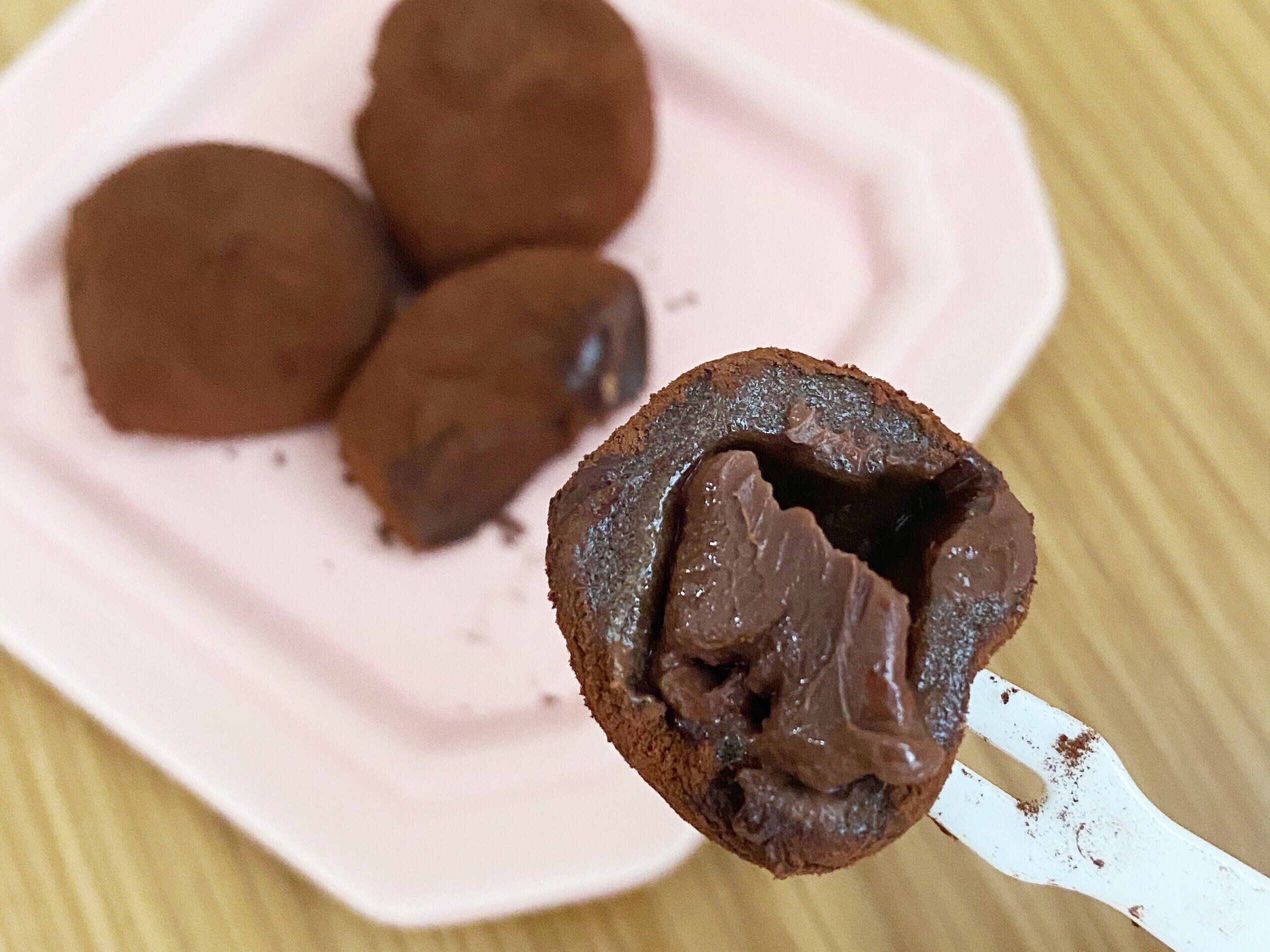 1口でパクっと食べられるので、ビターなココアパウダー、甘さ控えめの餅、濃厚なチョコクリームが口の中で一気に混ざり合います。