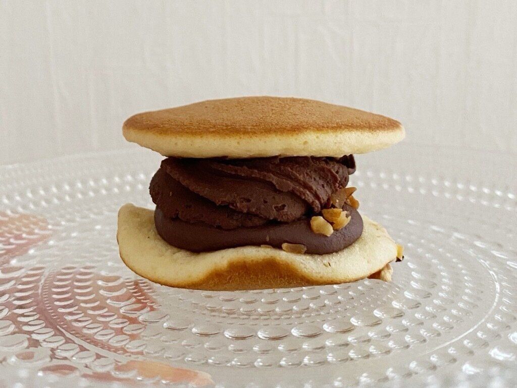 アーモンド入りのチョコクリームとチョコホイップクリームを挟んだ、小さなどら焼きのようなビジュアルのスイーツ。