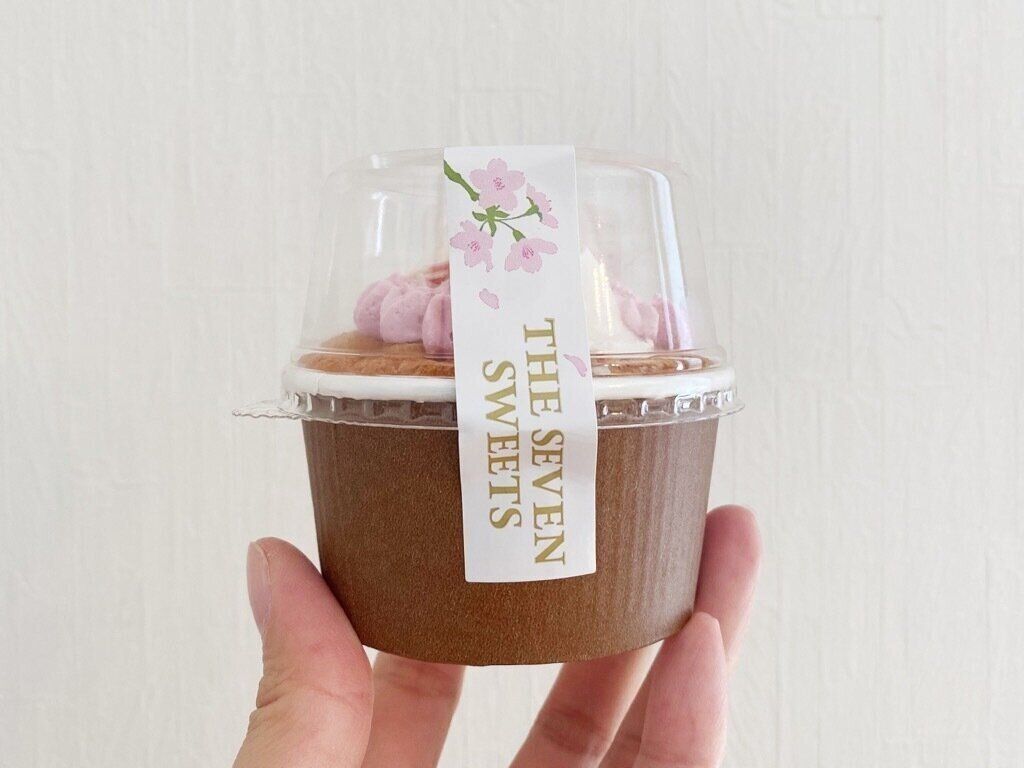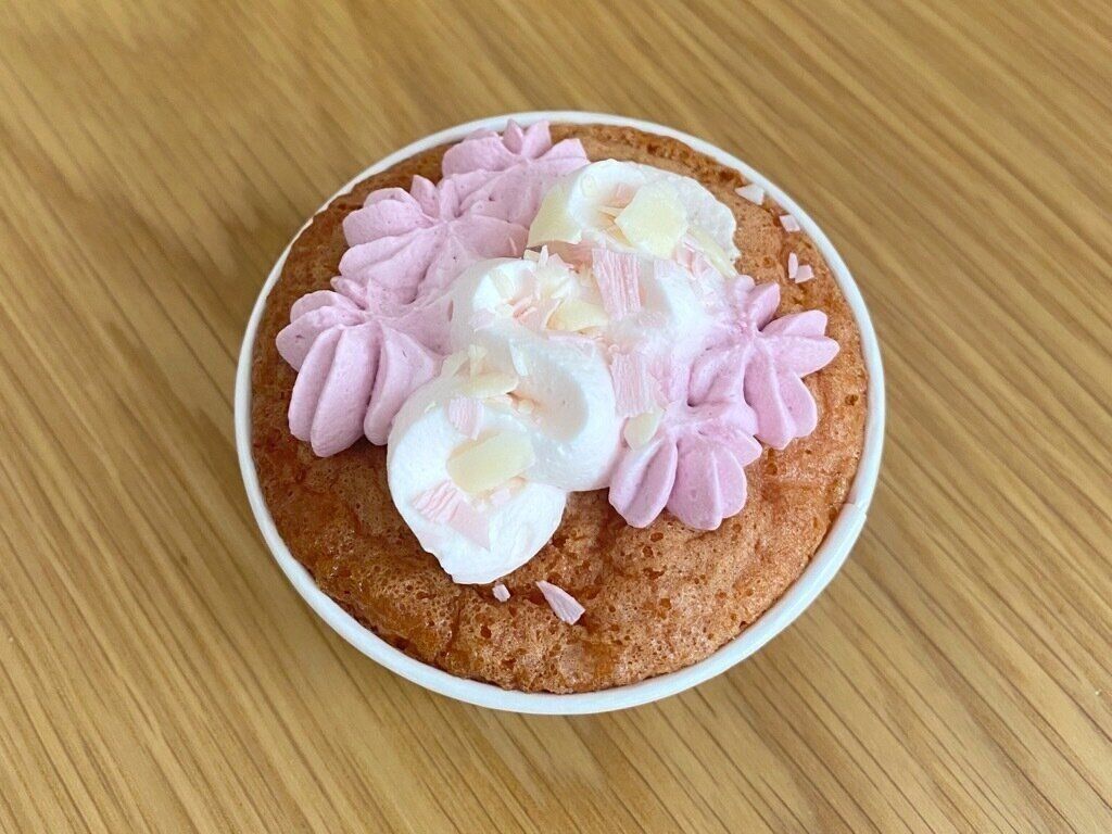 さくら風味のシフォンケーキの中にさくらホイップクリームを詰め、さくら味のクリームとホワイトチョコレートをトッピングしたカップケーキ。