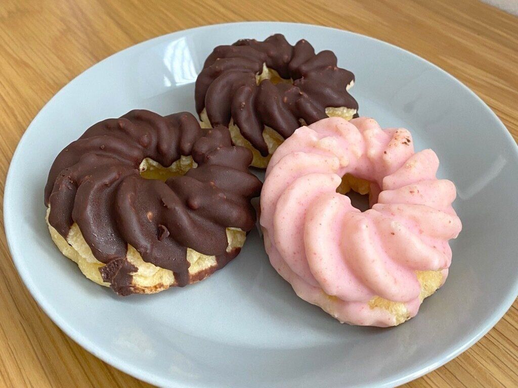 北海道産牛乳を使用したミルクホイップを入れて、ミルクチョコとイチゴチョコでコーティングしたドーナツ。