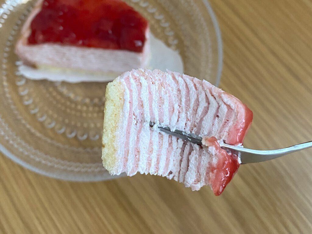 口どけなめらかなイチゴクリームと柔らかなイチゴクレープ生地は甘さひかえめ。