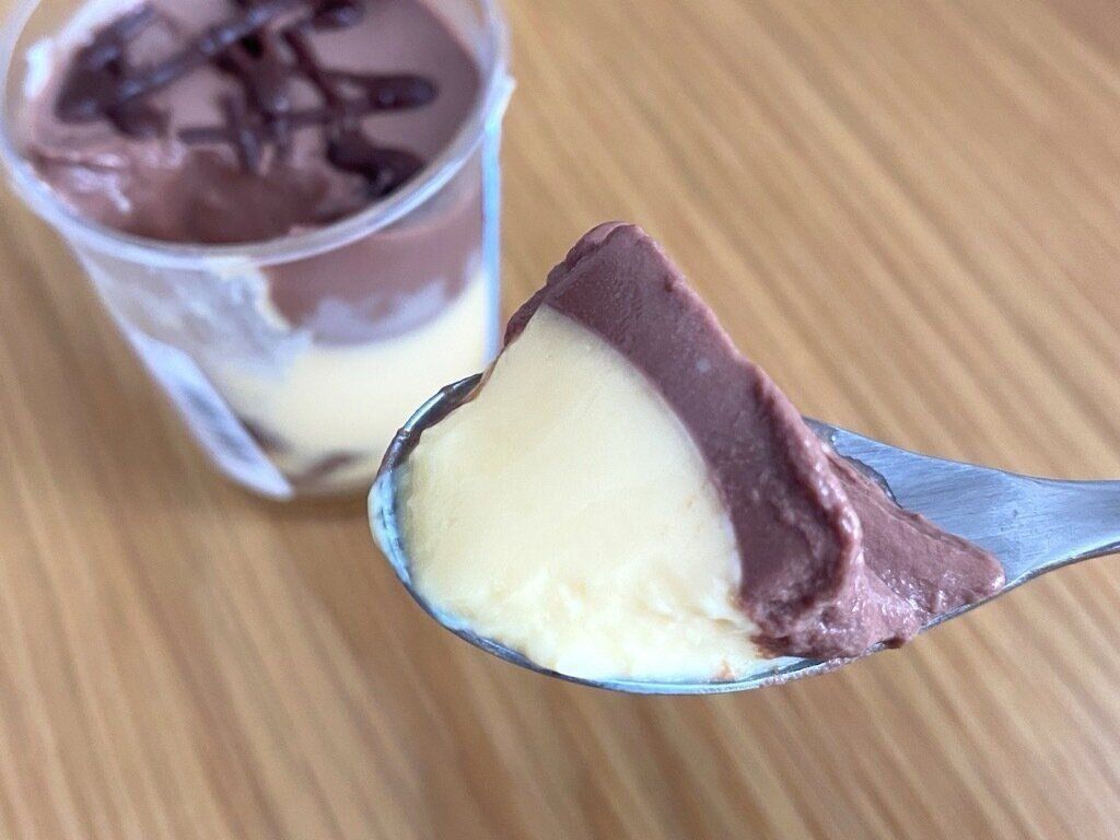 下層のチョコレート味のスポンジと合わさるとチョコレートの風味が一気にアップし、濃厚なチョコレートの味わいを楽しめます。