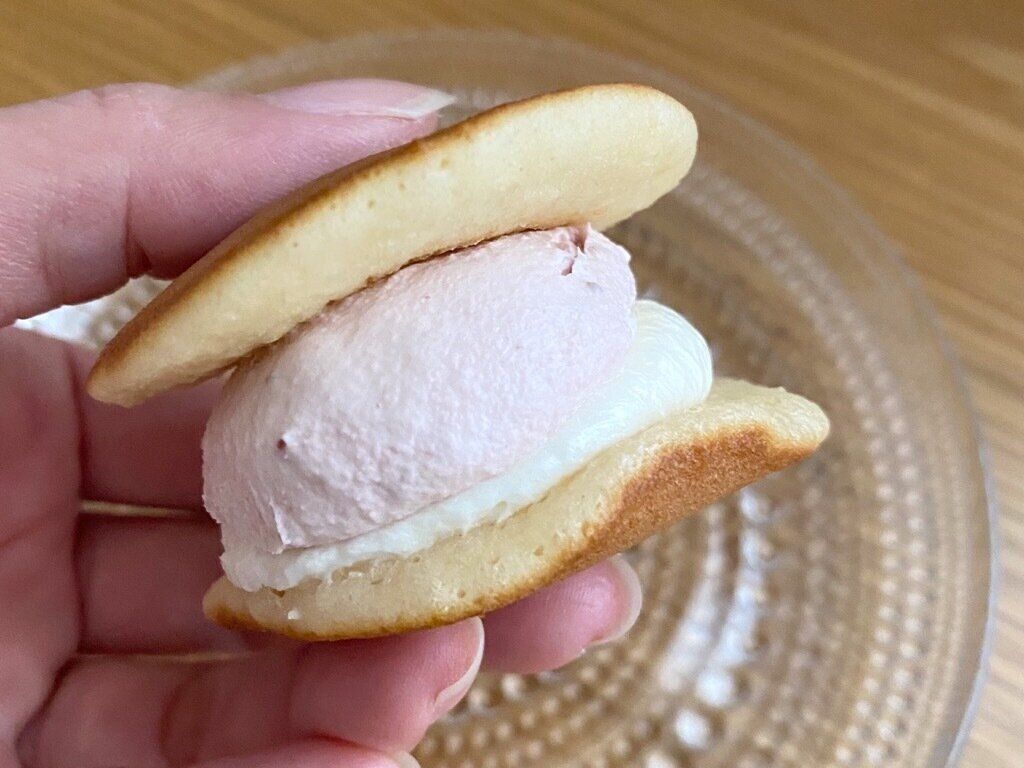苺クリームは苺の爽やかな風味が特徴的で、酸味と甘味のバランスがよく優しい甘さのどら焼き生地とよく合っています。