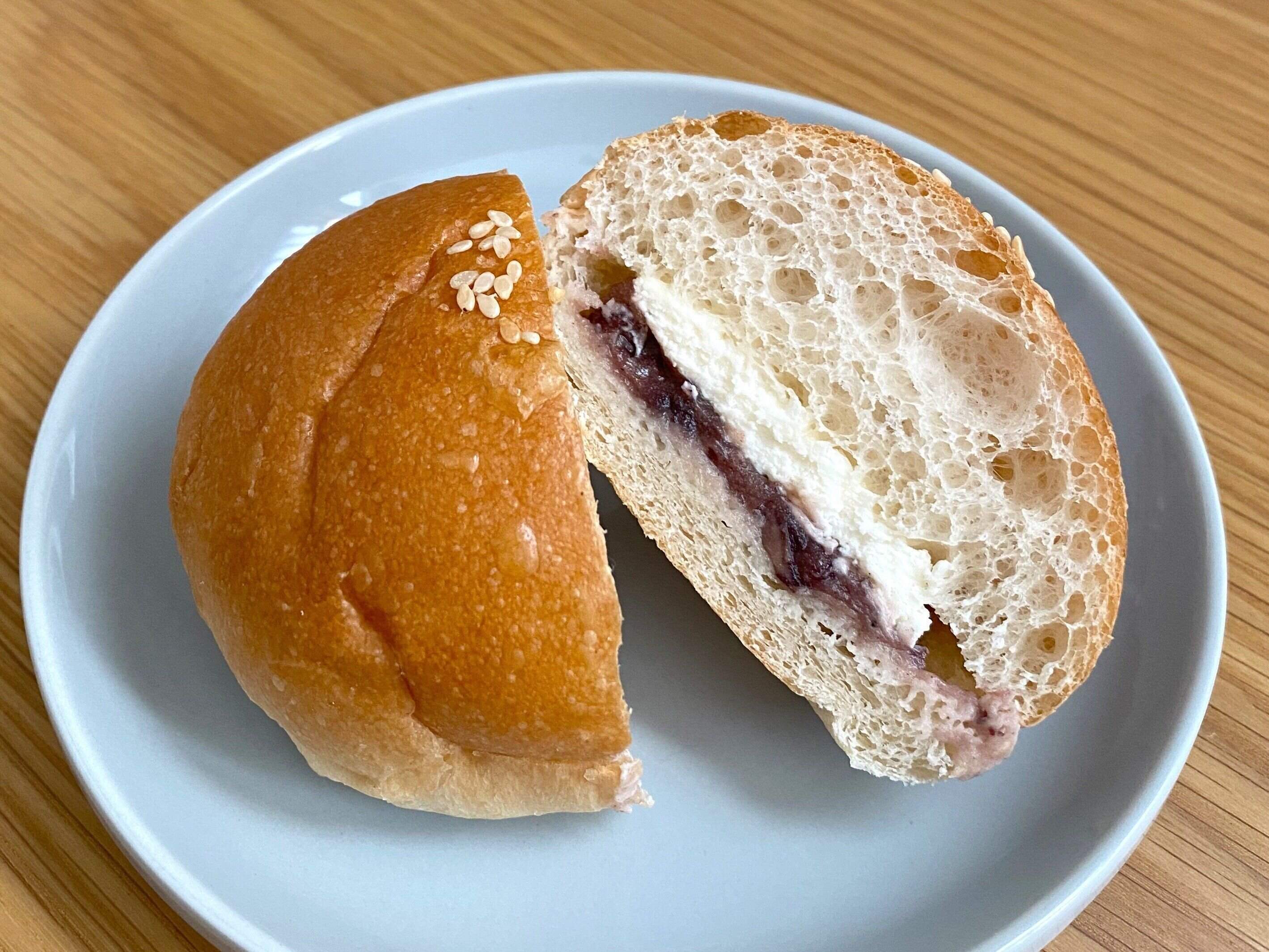 持ち上げた時はパンがふわふわとした印象でしたが、食べてみるともっちりと弾力のある食感で食べ応えがあります。あんは甘さ控えめ、あずきの風味とクリームチーズのクリーミーな味わいが意外と合っていて驚き。