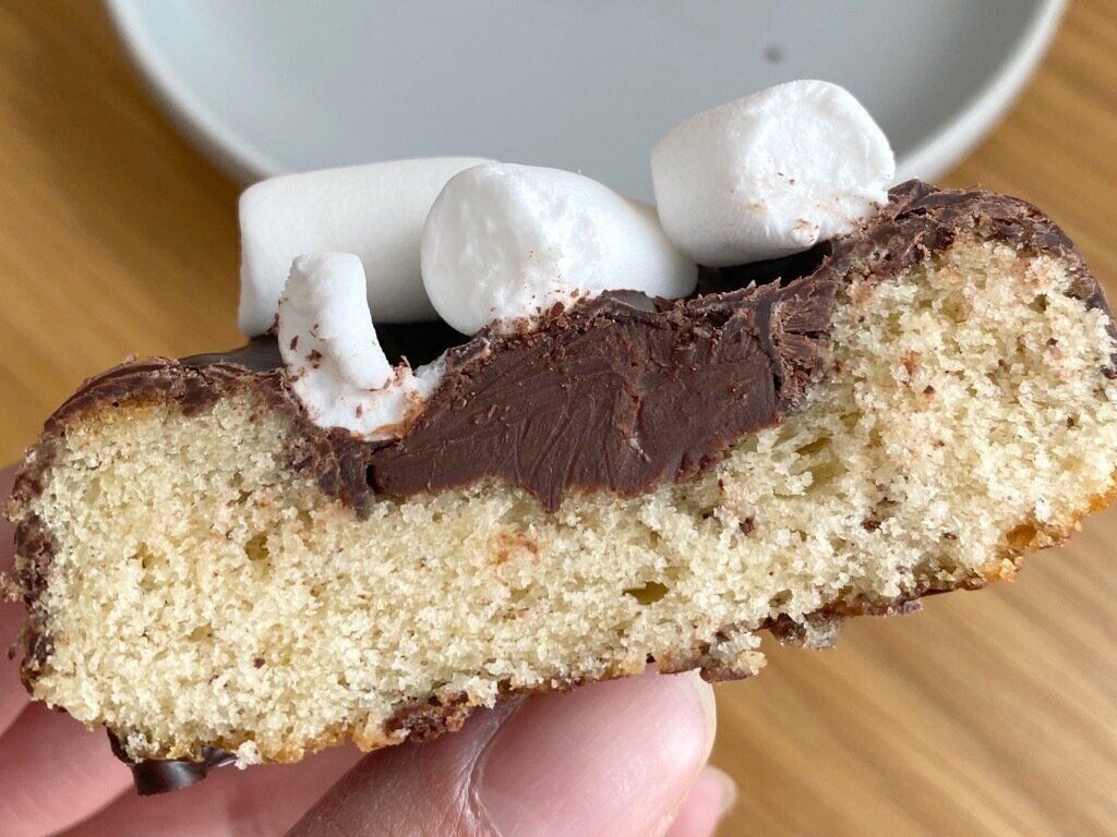 チョコチップが混ぜ込まれたケーキ生地にチョコクリームを絞り表面をチョコレートでコーティング。トップにマシュマロをのせたパンスイーツです。