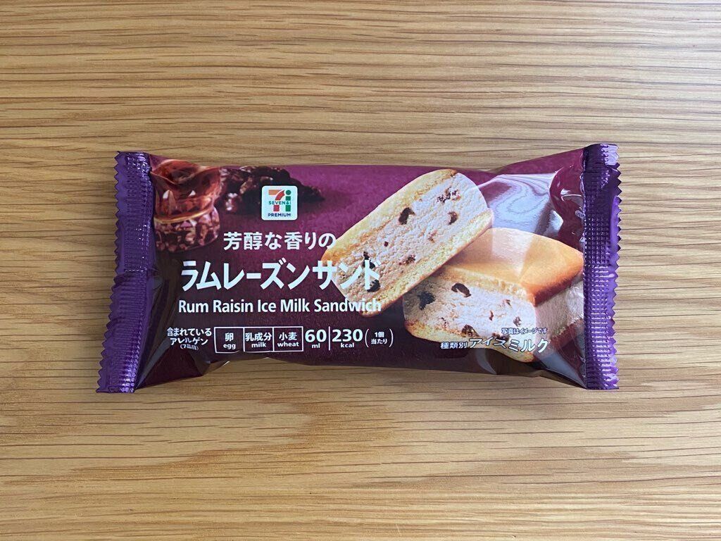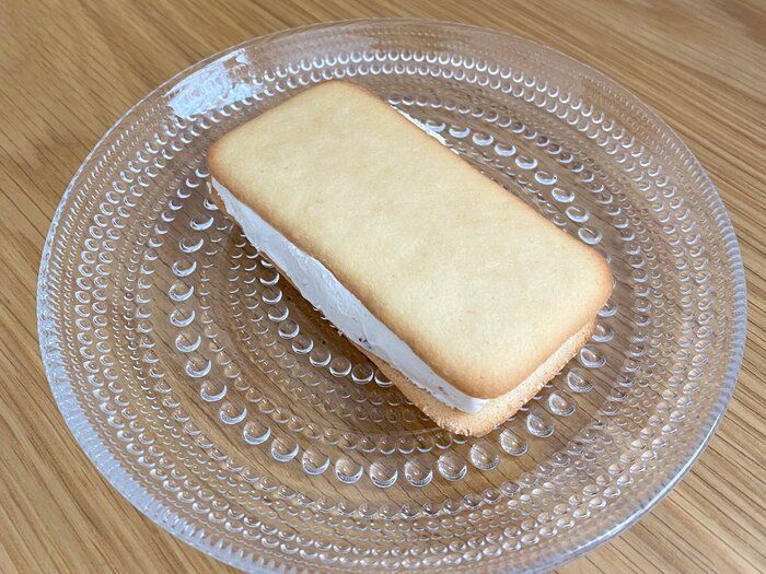 ラムレーズン入りのクリームをシンプルなビスケット生地でサンドしたアイスです。