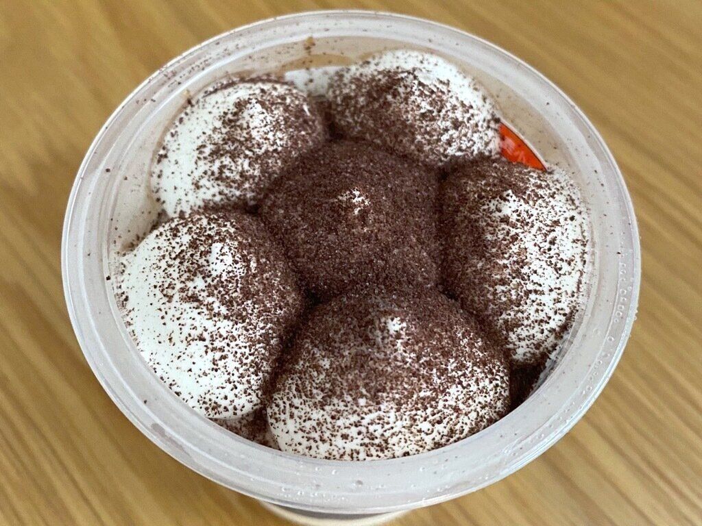 下層から、マスカルポーネ味アイス、コーヒーシロップ、ココアクッキー、カカオニブ入りコーヒーアイス、マスカルポーネ味ホイップ、ココアパウダーを重ねたパフェ風アイスです。