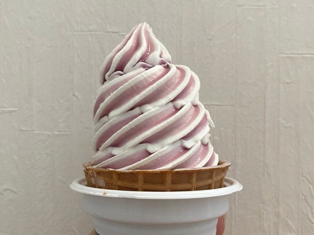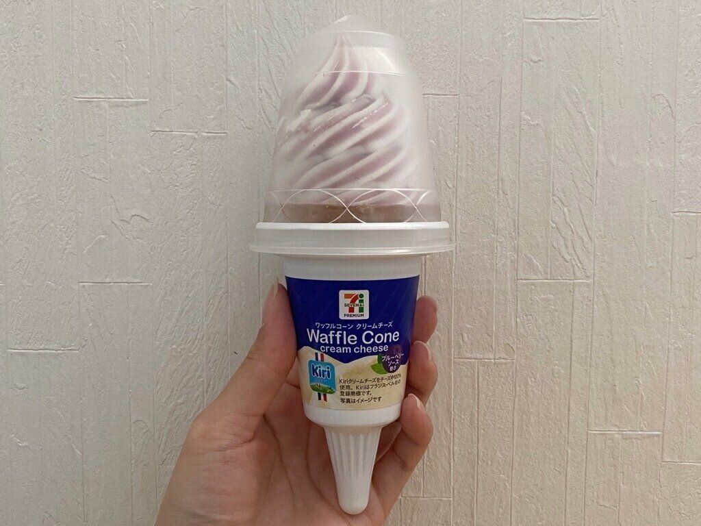 クリームチーズ味のソフトクリームとブルーベリーソースを合わせたワッフルコーンアイス。