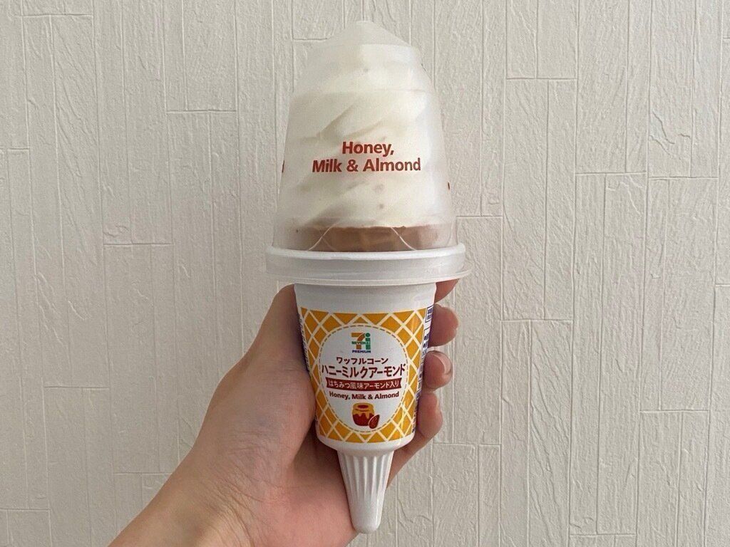 ハニーミルク味のアイスにハチミツ風味のアーモンドを混ぜ込んだ、ワッフルコーンアイスです。