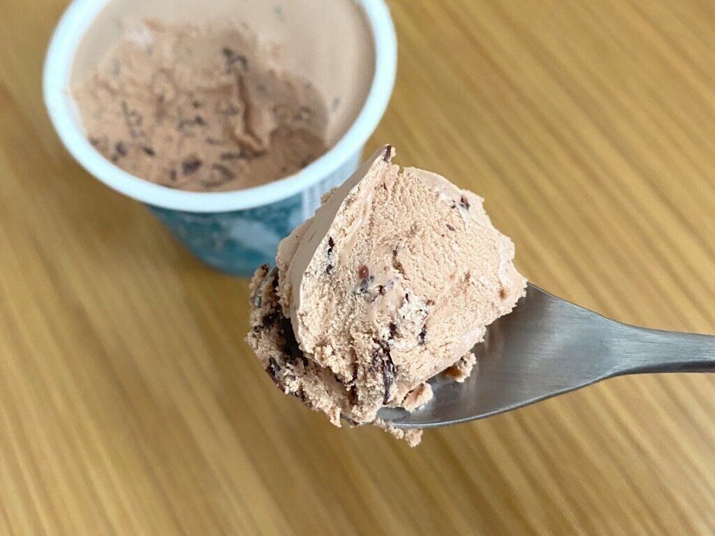 蓋を開けるとシンプルなチョコレートアイスのようなビジュアルですが、口に入れた瞬間にミントの爽やかな香りがふわぁっとひろがります。ミントの香りは優しく香る程度でチョコレートの濃厚な味わいと生乳のミルキーさがメインのアイスです。